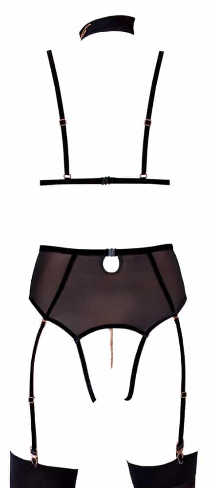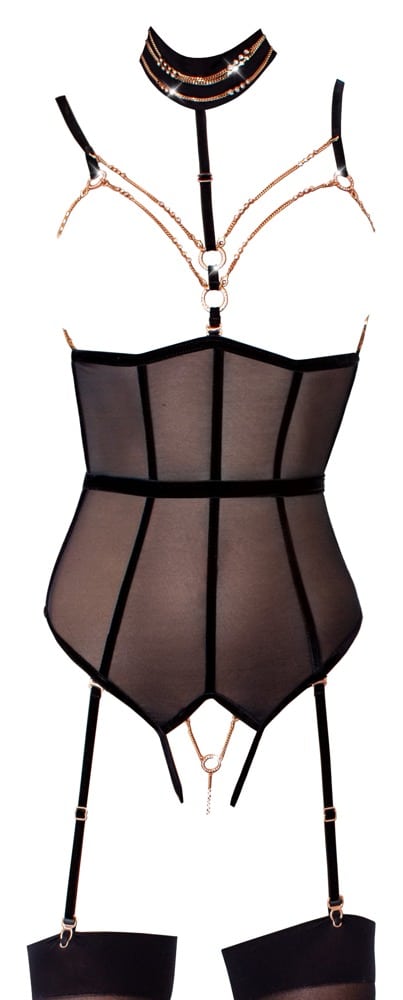 Cuploze body van Abierta Fina met volledig open kruis, gemaakt van stretchy kant met elastische fluwelen strepen en roségoudkleurige accenten. De schouderbandjes en jarretelbandjes zijn verstelbaar. De verticale decolletéketting (met knoopsluiting) is eveneens afneembaar, evenals de borstkettinkjes met kleine karabijnhaakjes en de kruisketting met sierring. Alle kettingen zijn bovendien versierd met kleine strassteentjes.