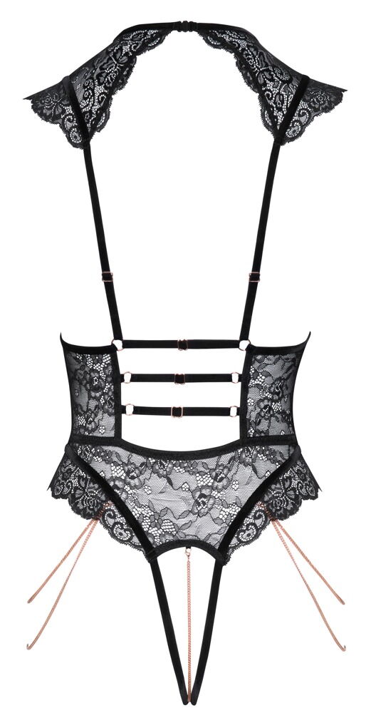 De open zwarte body van Abierta Fina is gemaakt van zachte, rekbare bloemenkant. De fluwelen, rekbare bandjes en roségoudkleurige details benadrukken de elegante en onthullende look. De body heeft verleidelijke open cups en kanten schouderbedekking. Aan de voorkant van de hals zit een sprankelend strassteentje, en aan de achterkant een klein haaksluiting. Tussen de open cups hangt een prachtig hartvormig hangertje. De open cups worden omlijst door rekbare bandjes. Bij de beenuitsnijdingen zijn 2 afneembare kettingen bevestigd. De body is hoop opgesneden. De stimulerende ketting over het open kruis is ook afneembaar. De bh-bandjes en de 3 rekbare fluwelen bandjes aan de achterkant zijn verstelbaar voor een perfecte pasvorm.