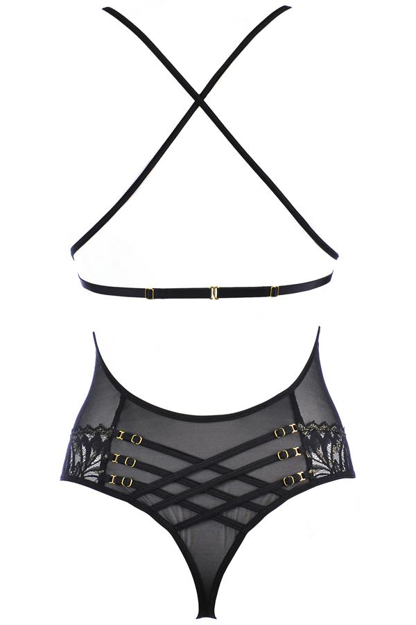 Deze romantische zwart-gouden body is een combinatie van klassiek zwart en subtiele gouden elementen. Het opengewerkte kant en de satijnen strikjes zorgen weer voor de sexy look. Twaalf straps zitten aan de voorkant over de buik en elk van hen heeft gouden decoraties.