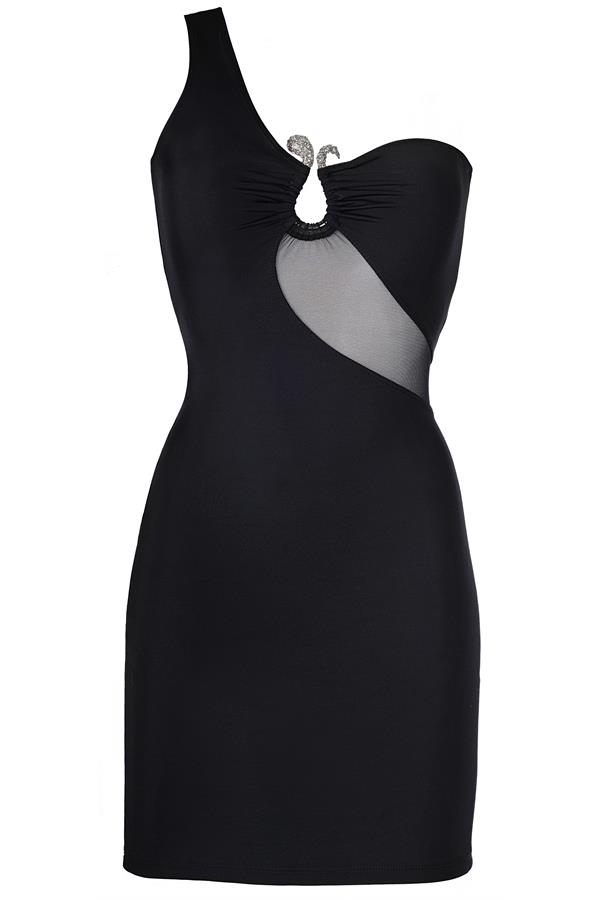 Deze prachtige jurk mag niet ontbreken in je garderobe. Een sensueel design en de combinatie van gaas en lycra geeft deze jurk stijl en elegantie. Het strassdetail in de halslijn geeft deze jurk nog meer verleiding.