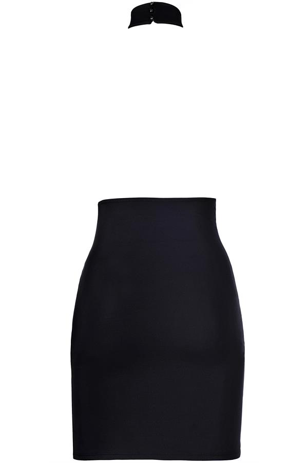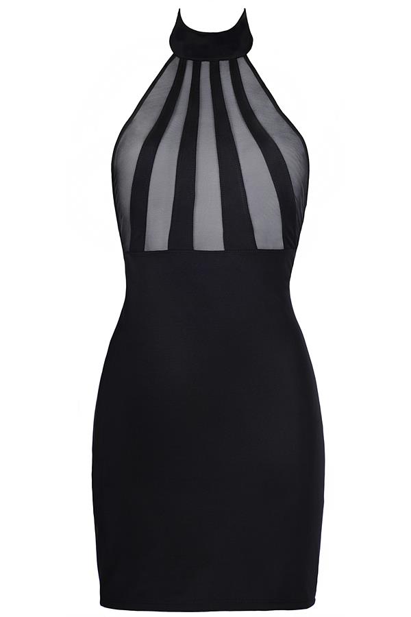 De jurk is gemaakt van zacht microfiber en gaas. Het heeft een kleine knoopsluiting achter in de nek. Deze verleidelijke jurk heeft een top van transparant gaas in banen.