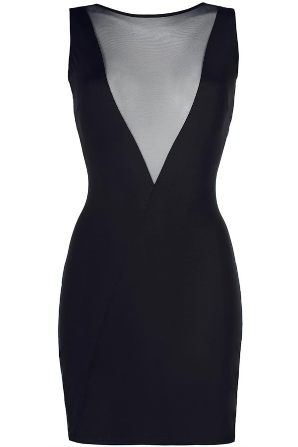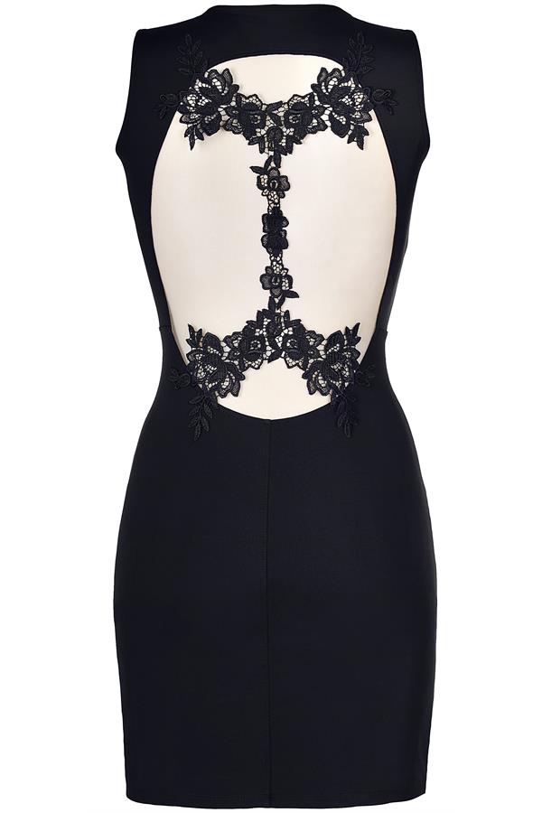 Deze verleidelijke jurk heeft aan de voorzijde een open halslijn met zwart gaas. De prachtige open rug valt op door de kanten inzet op een ondergrond van nude gaas.