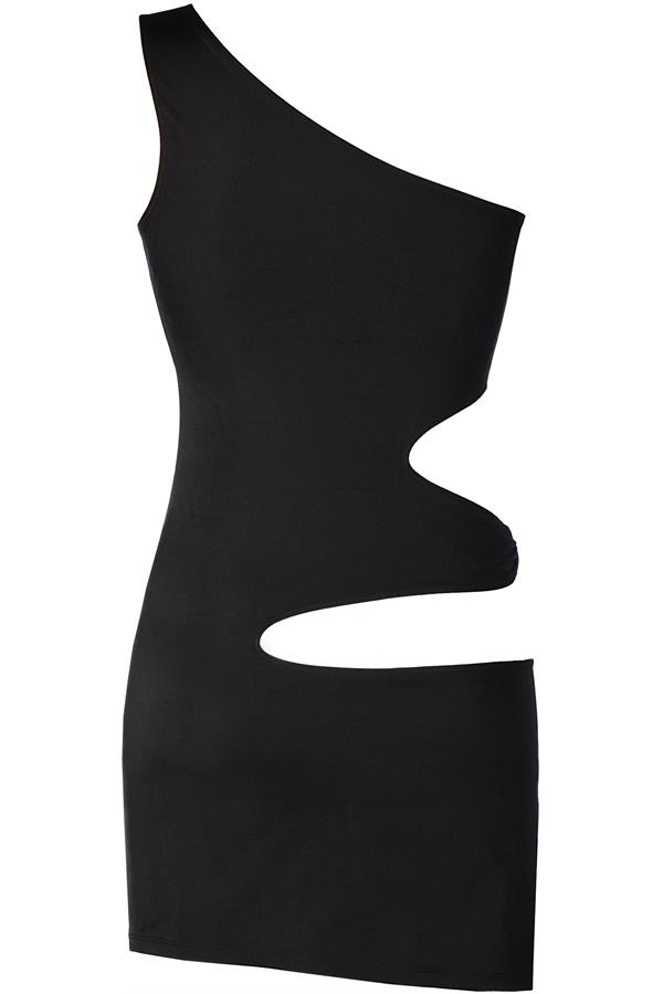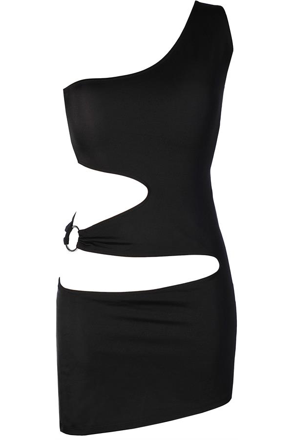 De Dione jurk van Axami is een verleidelijke, sensuele one-shoulder-dress. Door zijn speelse cut-outs benadrukt het de taille en de rondingen van de heupen. Een extra versiering in de vorm van een glanzende ring geeft de compositie nog een extra speels accent. Door het rekbare materiaal is het een zeer praktisch kreukvrij jurkje dat ook makkelijk over een bikini kan worden gedragen. Ideaal vakantiejurkje!