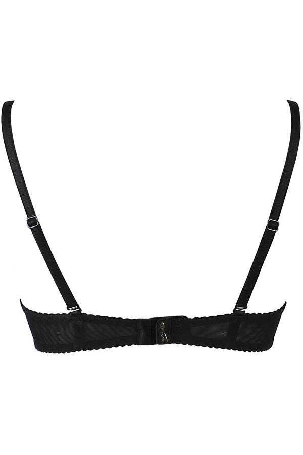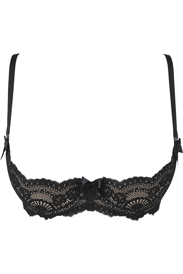 Deze open cup BH is een subtiele en romantische combinatie van klassiek zwart kant met een beige voering. De cups zijn voorzien van beugels. De achterkant is doorzichtig met afneembare, verstelbare bandjes en een dubbele haak op de sluiting. Een klein strikje aan de voorkant siert de BH.