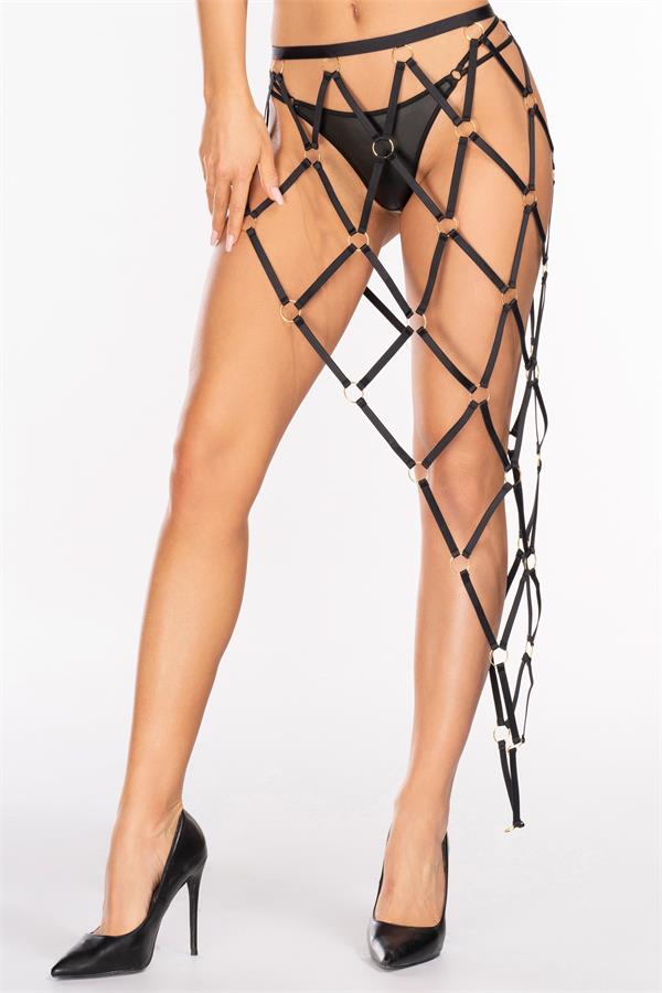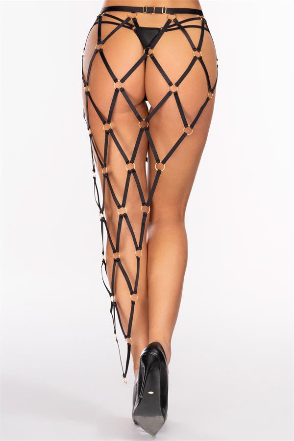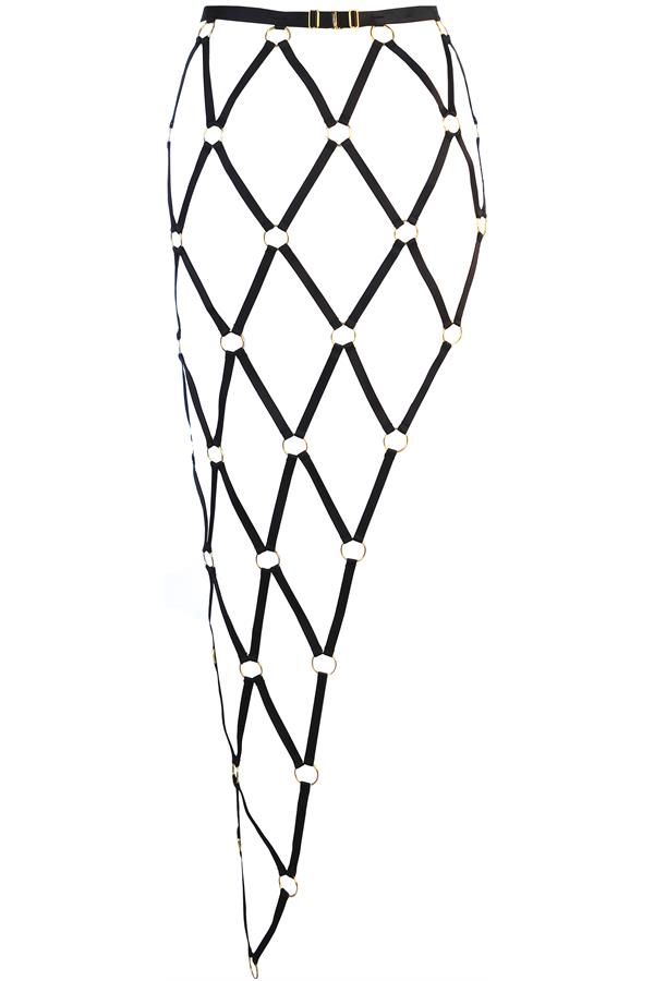 Hoe gaaf is deze rok? Deze kun je perfect over je lingerie aantrekken. Het is in de boord verstelbaar. De rok bestaat volledig uit elastische straps met gouden ringetjes. Dit is echt dress to impress!