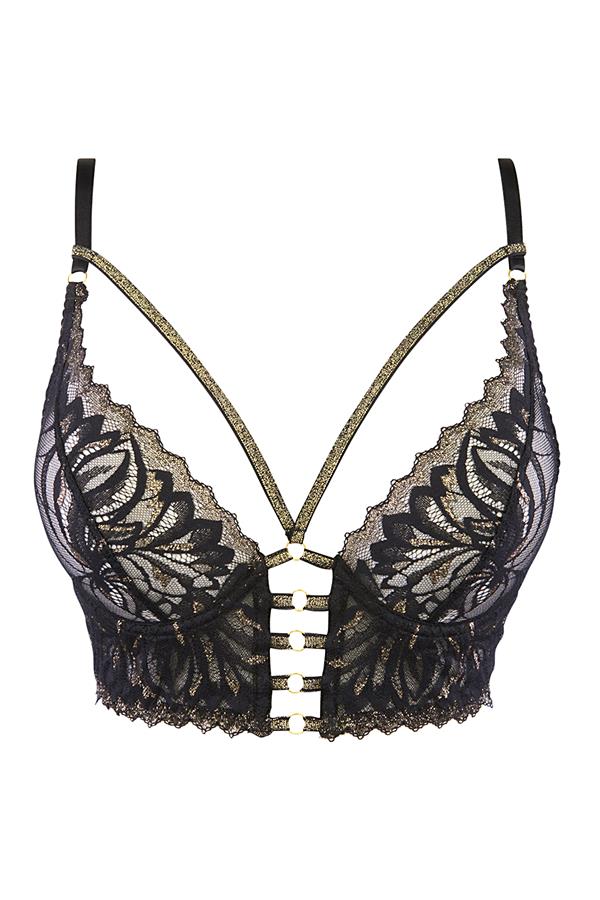 Deze Bralette is gemaakt van delicaat kant met gouden accenten. Dit model is een zogenaamd half corset of bralette. Glinsterende gouden bandjes zijn met ringetjes verbonden aan de BH. De BH heeft een beugel voor fijne ondersteuning en aan de achterkant is de sluiting d.m.v. 5 haakjes verstelbaar. Uiteraard zijn ook de schouderbandjes in lengte aan te passen.