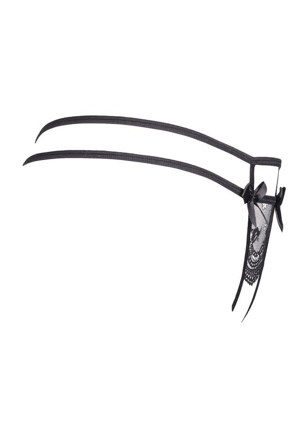 Dit ondeugende stringetje heeft een delicaat stukje kant dat het kruis open laat. Ook heeft de string dubbele straps over de heupen. Een sensueel en origineel model dat zeker de aandacht zal trekken.