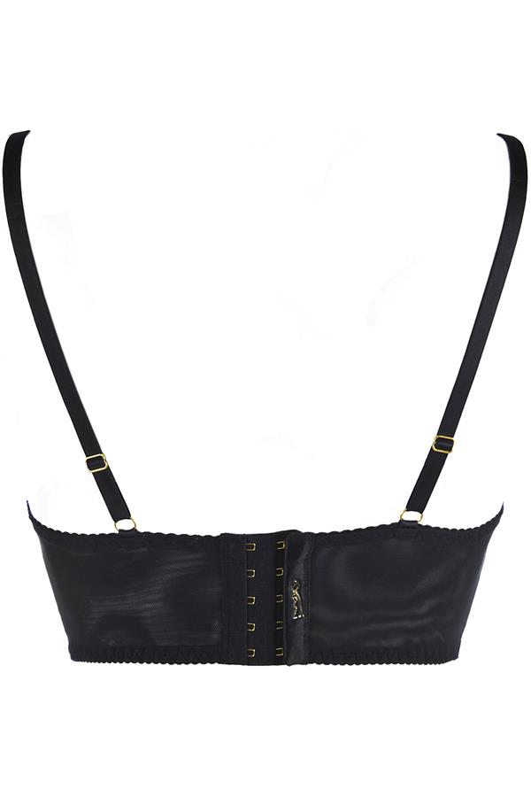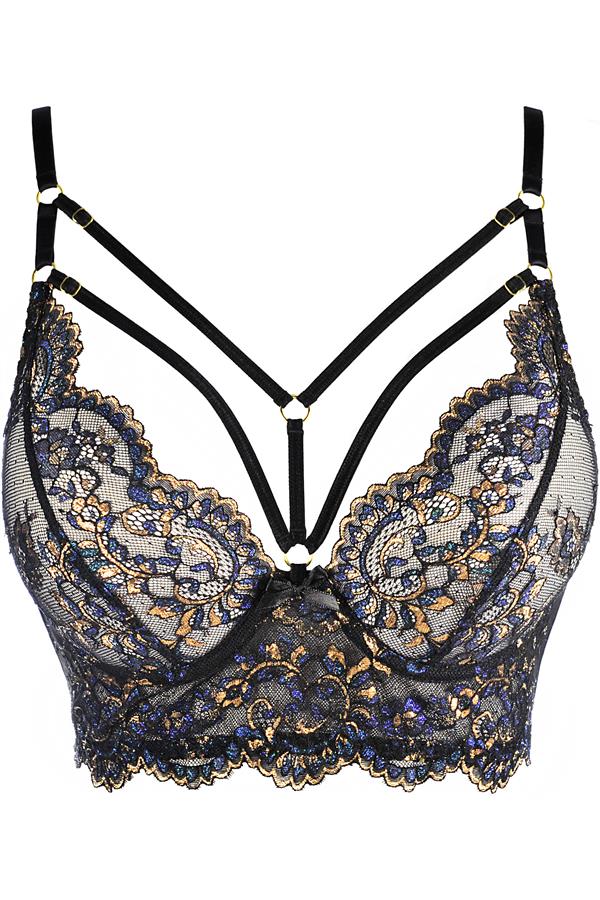 Deze BH is gemaakt van delicaat kant met blauw-gouden accenten die opvallende glinsteren in het zwarte kant. Dit model is een zogenaamd half corset of bralette met een extra brede strook doorschijnend kant en elegante straps in het centrale deel van de buste. De cups zijn rekbaar en bieden ruimte aan grote borsten. De verstelbare sluiting heeft 5 haakjes met draagcomfort.