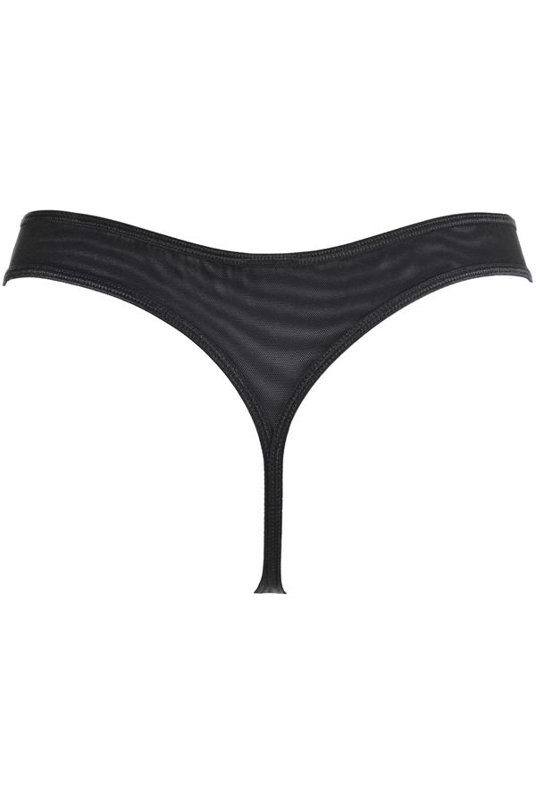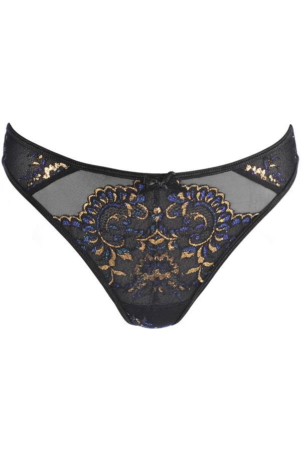 Charmante string van comfortabel gaas met kanten voorzijde waarin blauw-gouden accenten opvallend glinsteren in het zwart.