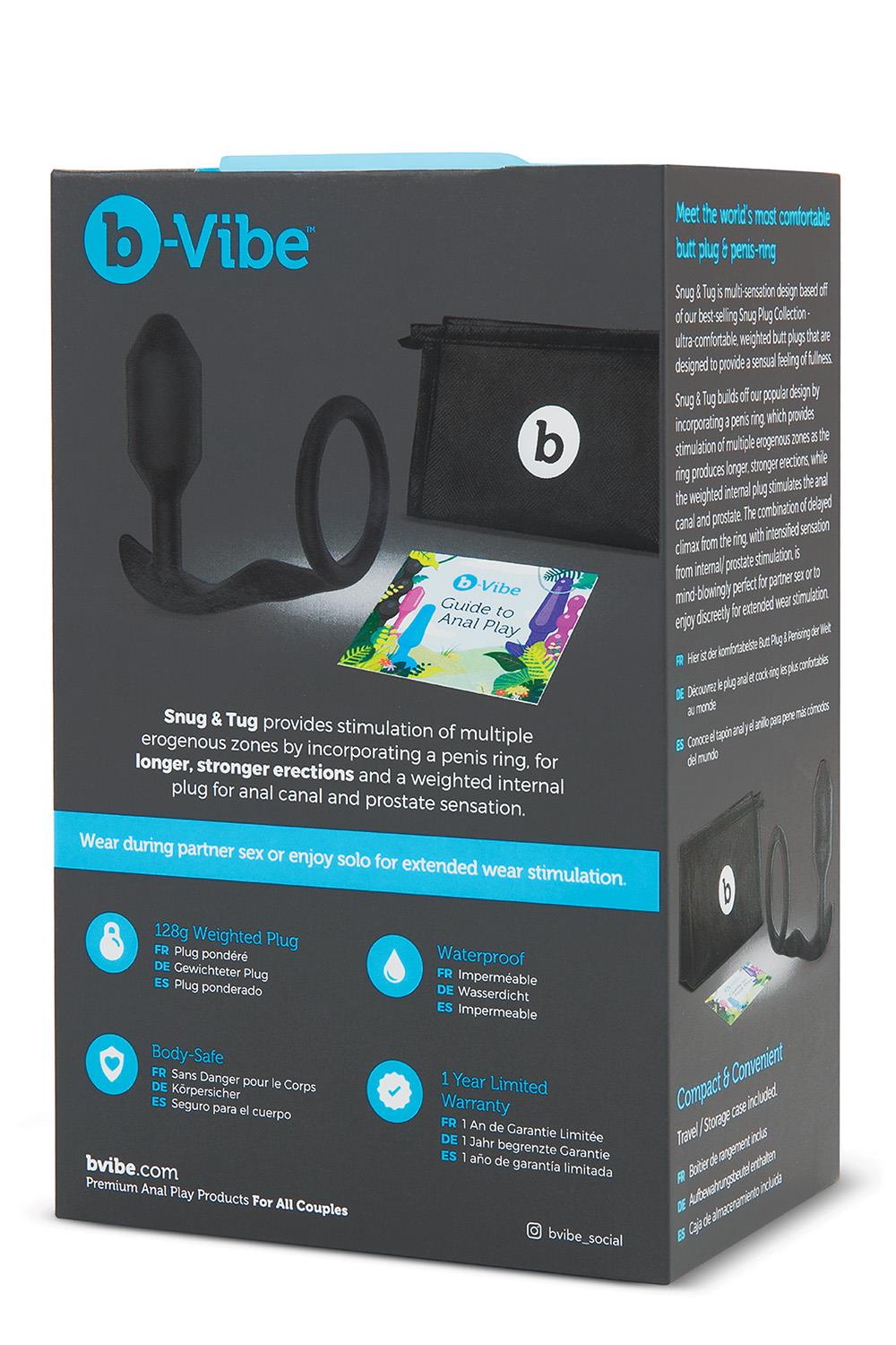 Snug & Tug is een anale plug in combinatie met een cockring. Snug plugs zijn de verzwaarde buttplugs van b-vibe die zijn ontworpen om een sensueel gevoel van volheid te geven. De cockring zorgt voor langere, sterkere erecties, terwijl de verzwaarde interne plug het anale kanaal en de prostaat stimuleert. De combinatie van een vertraagde climax uit de ring, met een intenser gevoel door interne/prostaatstimulatie, is verbluffend perfect voor partnerseks of kan discreet langdurig gedragen worden.