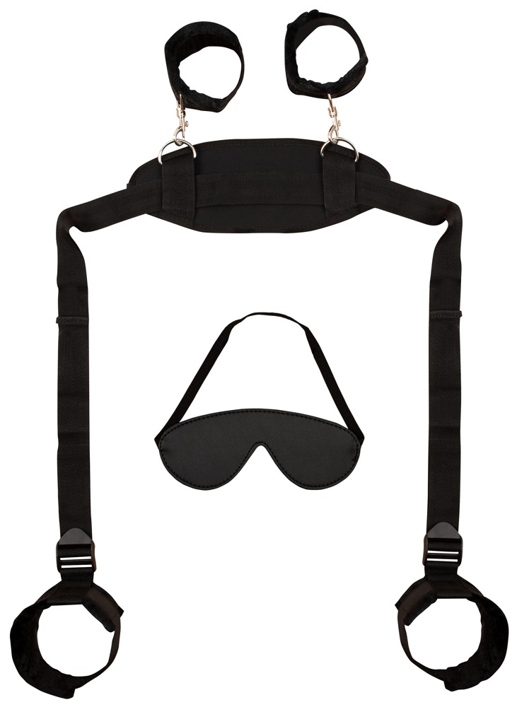 Gecombineerde fixatie van Bad Kitty voor nek, polsen en enkels. De boeien zijn aan de binnenkant opgevuld met zacht pluche en kunnen worden aangepast met de sterke klittenbandsluitingen voor een perfecte pasvorm. De bevestigingsbanden die naar de enkelboeien leiden, kunnen worden aangepast. De polsboeien hebben karabijnhaken en kunnen van de neksteun worden verwijderd. Inclusief een blinddoek.