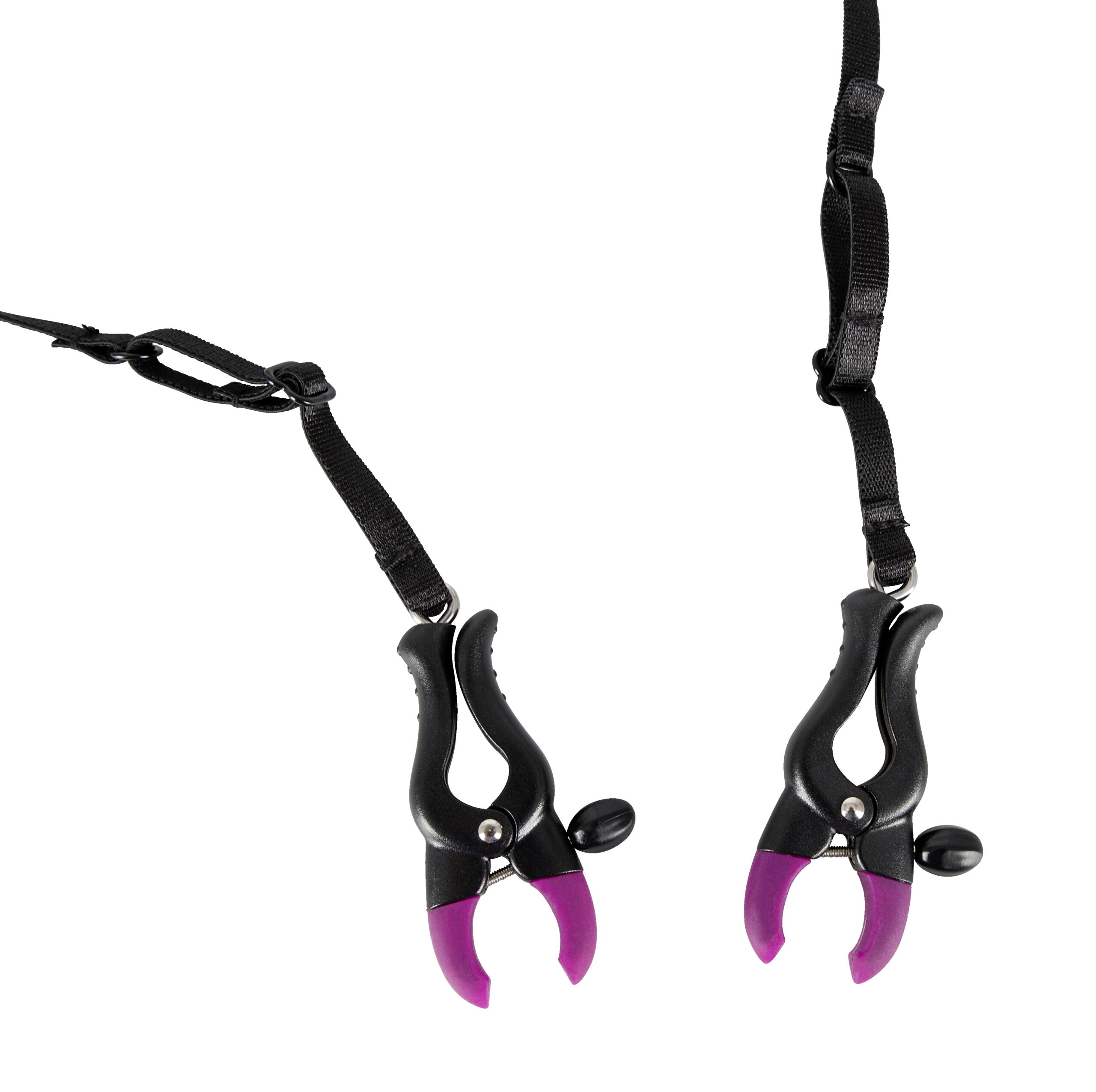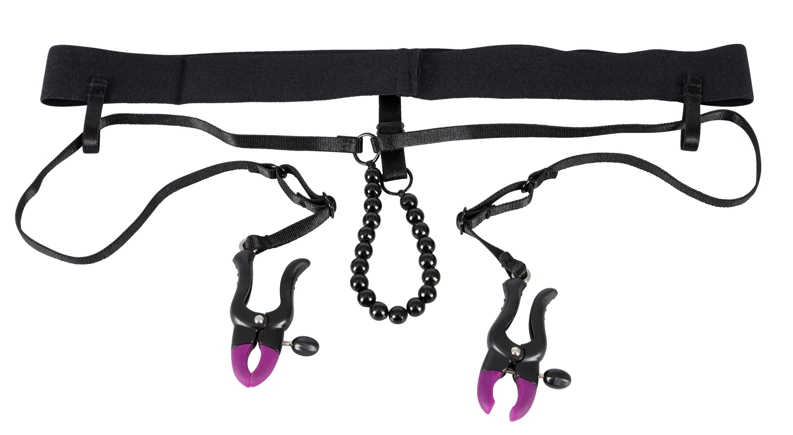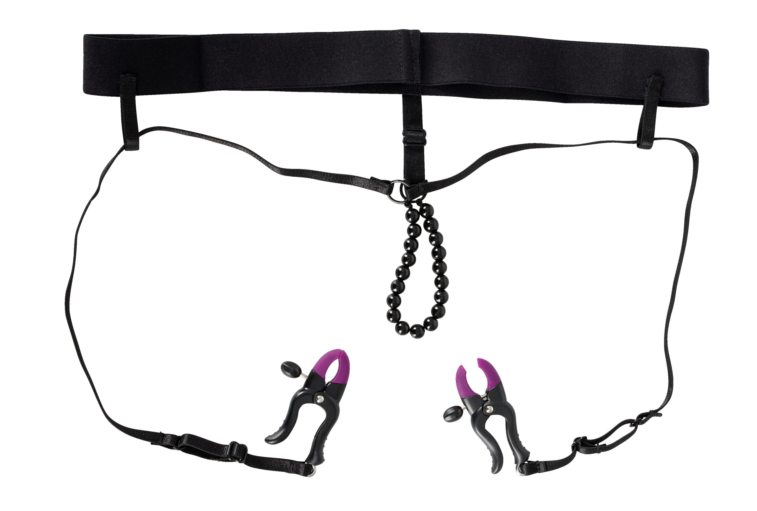 Zwarte spreidstring met klemmen voor de schaamlippen en kralen om de clitoris te stimuleren. De intensiteit van de klemmen kan eenvoudig worden aangepast met de stelschroeven. Plaats de banden vanaf de achterkant om de heupen en bevestig de klemmen aan de schaamlippen.