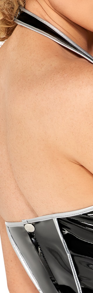 Korte halter jurk van Black Level in zwart vinyl met zilverkleurige siernaden in een getailleerd lijfje. De nauwsluitende top heeft een diepe halslijn en een wijd uitlopende rok. Halternek heeft een drukknoopsluiting.