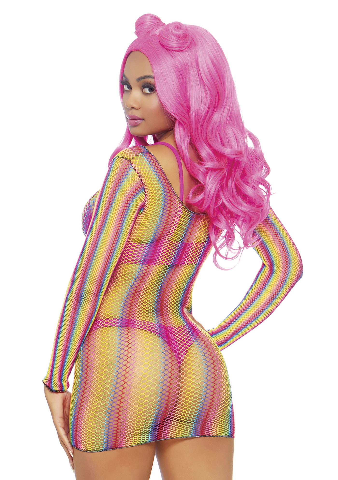 Een super sexy visnetjurkje met alle kleuren van de regenboog. Superleuke festivalwear of tijdens andere feestjes.