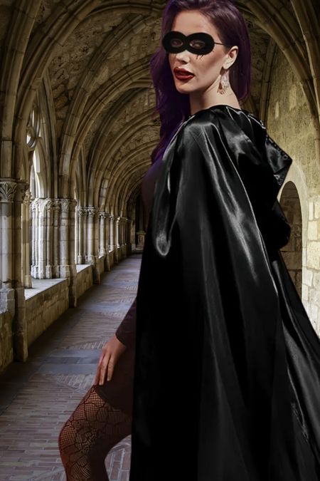 Dan is deze satijnen cape met masker van vilt een prima binnenkomer