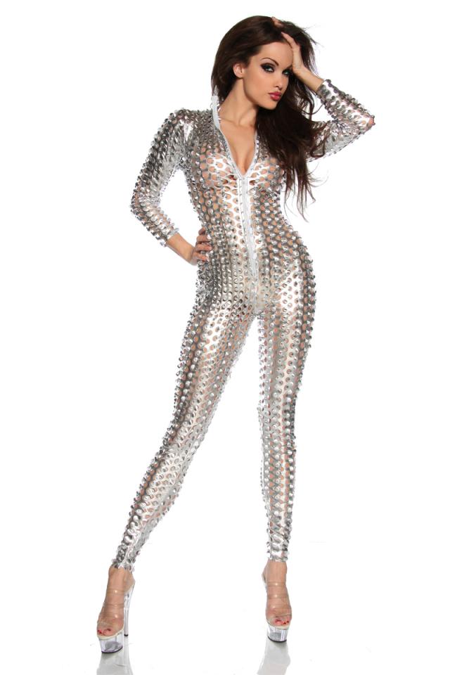 Super sexy catsuit in zilver metallic. De stof is met halve rondjes opengewerkt, wat een super effect geeft. Er zit aan de voorzijde een lange rits, die je naar eigen inzicht open kan zetten…