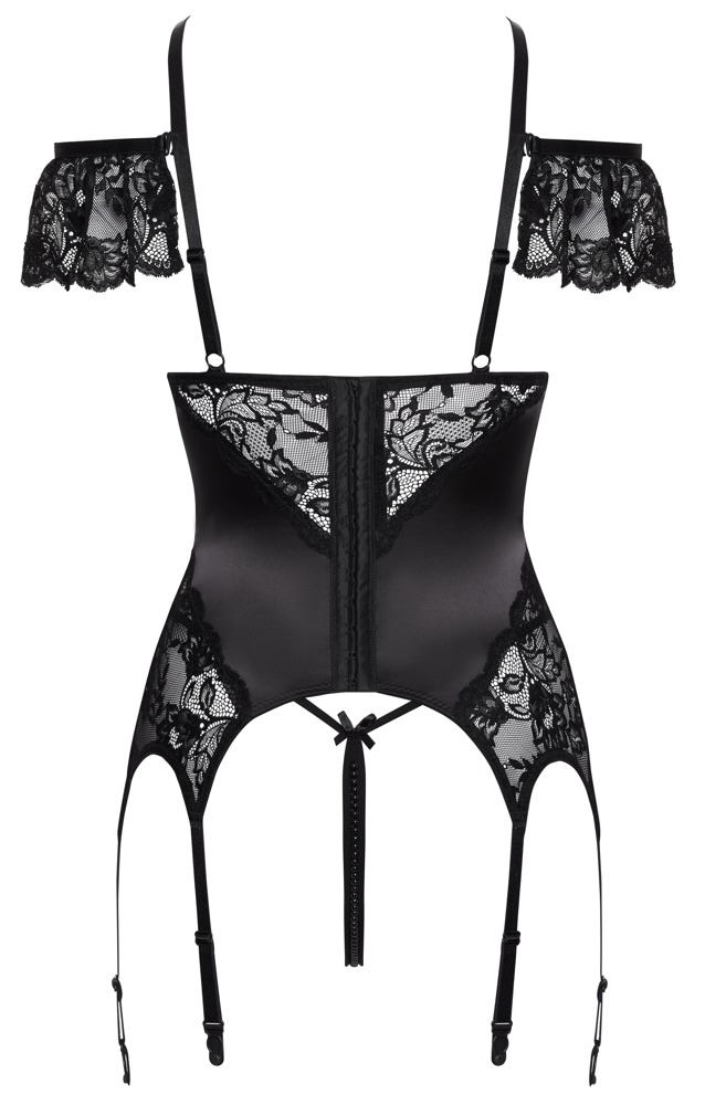 NEWCottelli Collection – Bustier Set met Jarretelles en Open Kruis String – Wetlook – Kant – Zwart