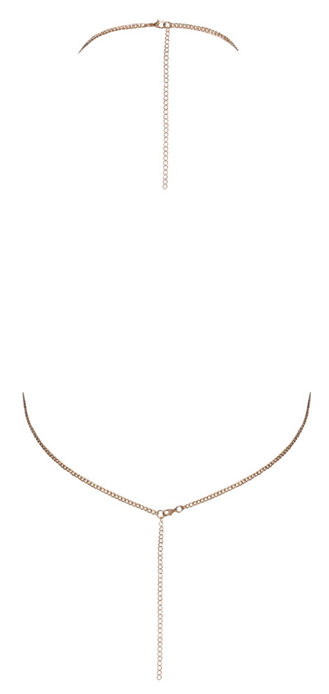 De top is gemaakt van een glanzende gouden kettingstructuur en subtiel bezaaid met sprankelende rhinestones voor een extra touch of luxe. De halternek en de ketting op de rug zijn beide verstelbaar dankzij handige karabijnhaaksluitingen, waardoor hij perfect aansluit op jouw lichaam.