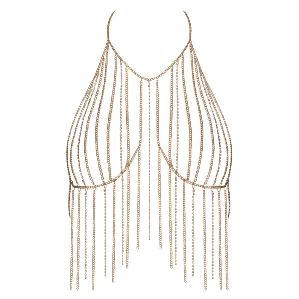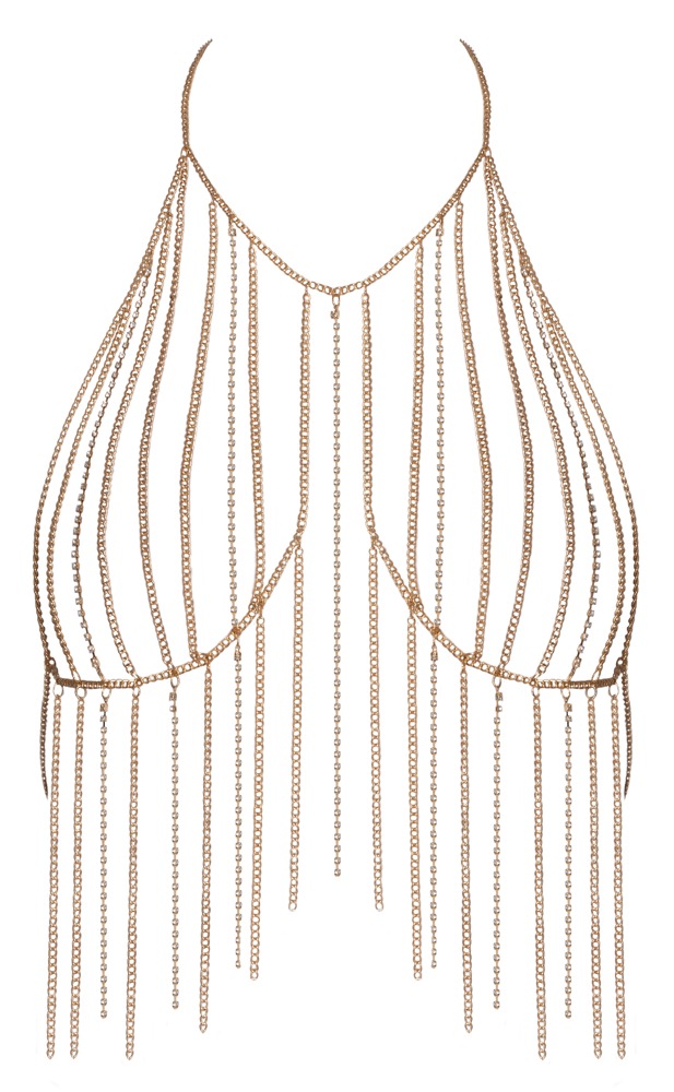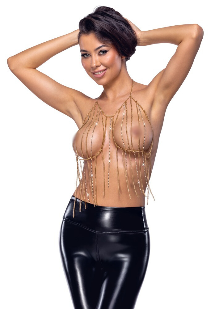 Deze goudkleurige chain top met strass is het ultieme sierraad voor vrouwen. Of je ‘m nu draagt op de blote huid of boven een sexy outfit – jij bent het middelpunt van de aandacht.