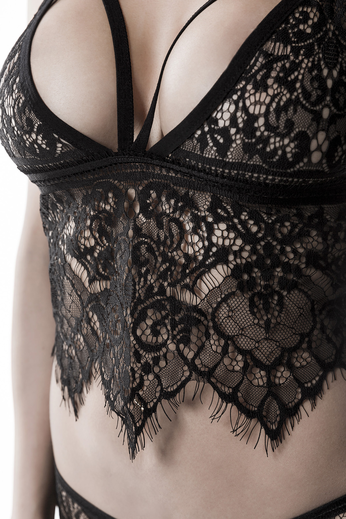 Super romantisch kanten setje voor hele romantische avondjes. Deze 2-delige set bestaat uit een hipster en een top waarvan de achterkant met een haakje wordt vastgemaakt. De bandjes zijn verstelbaar.
