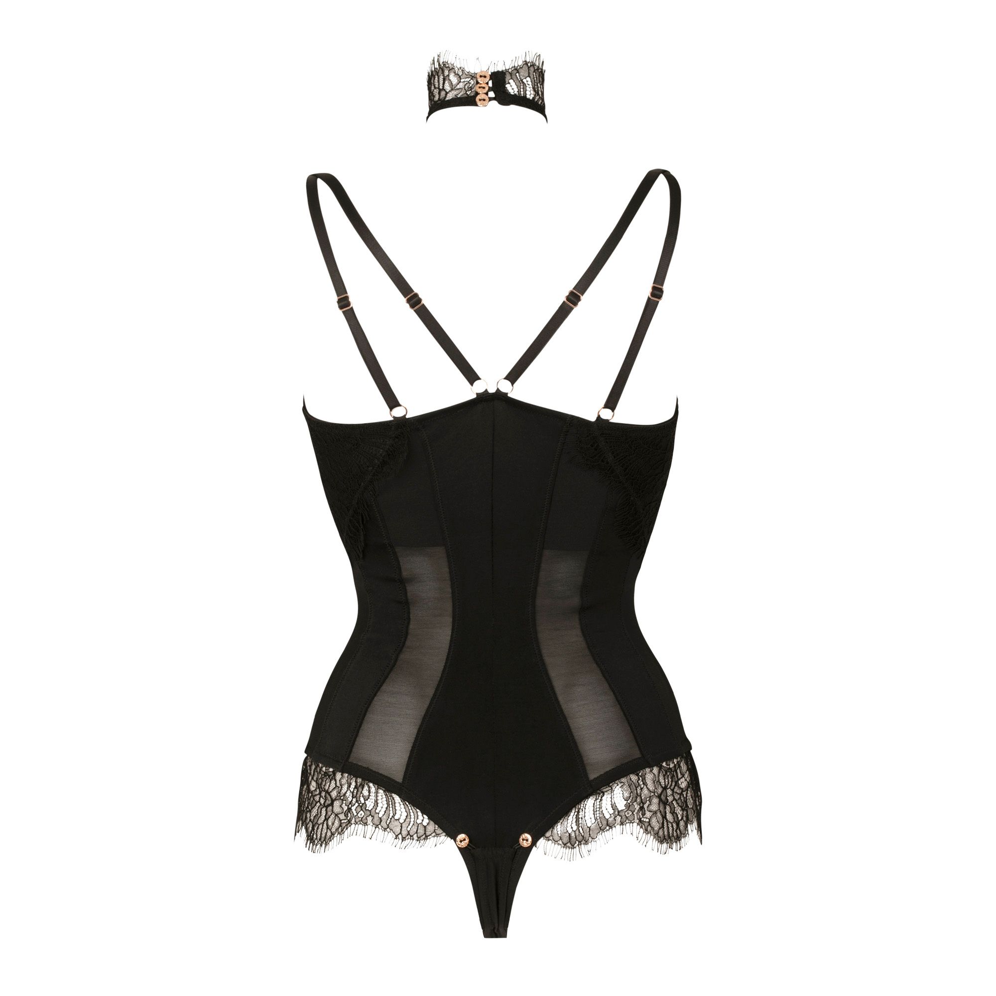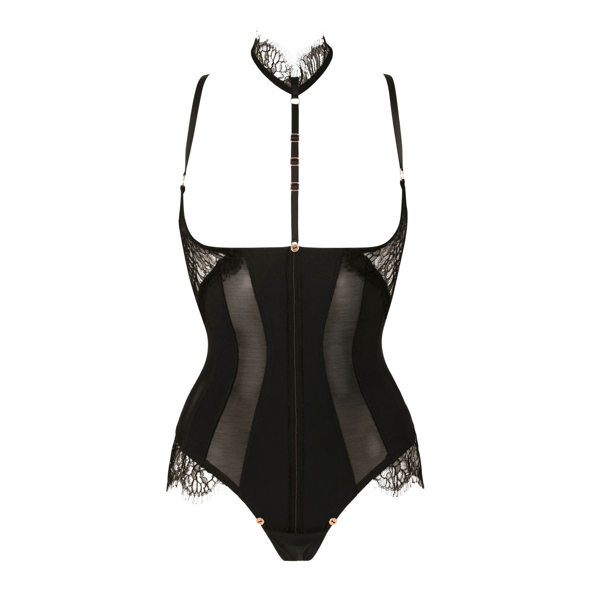 De bodysuit heeft een afneembare kanten choker die sluit met 3 rosé knoopjes en een knoopje tussen de borsten.