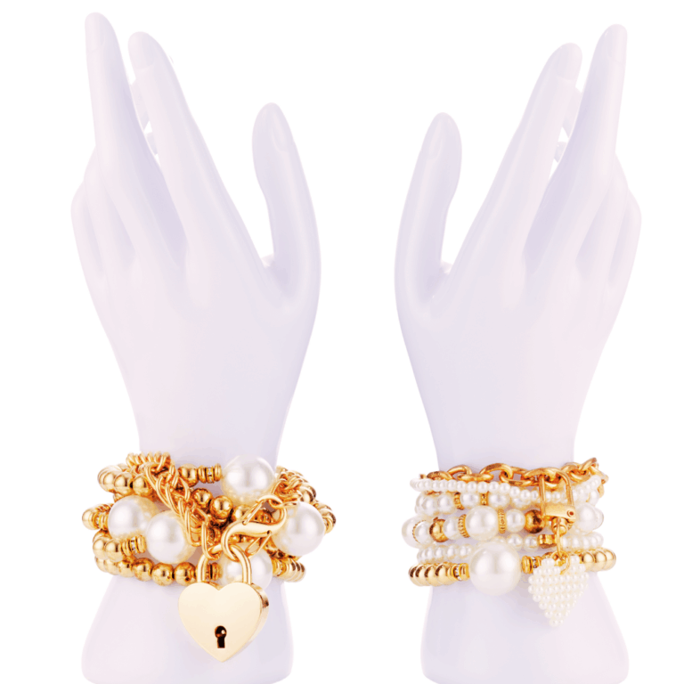 - Meervoudige armbanden met mix van goudkleurige schakels, parels en bedels