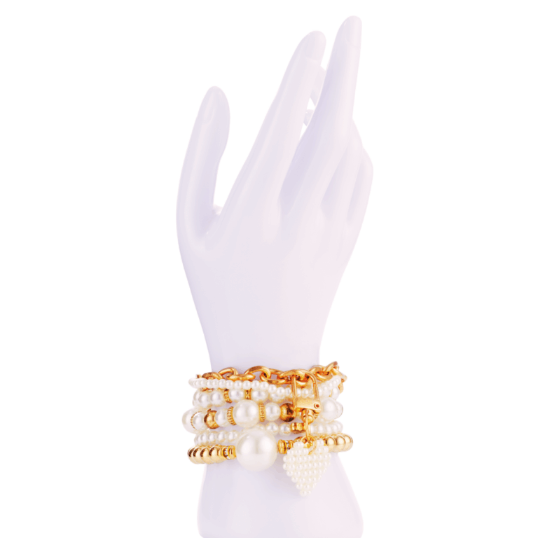 - Meervoudige armbanden met mix van goudkleurige schakels, parels en bedels