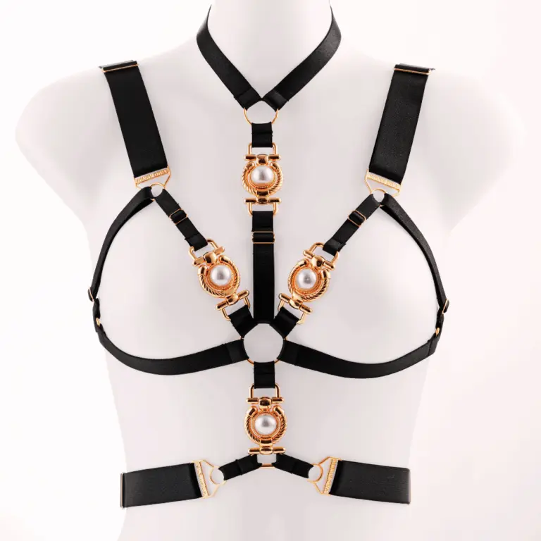 It’s Diva time komt met de exclusieve serie Decadence. Maak kennis met pure sensuele luxe de Pompeia I bra harness. Een verleidelijk en stijlvol borstharnas dat je lichaam siert met parels, goud en attitude, een onweerstaanbare blikvanger.