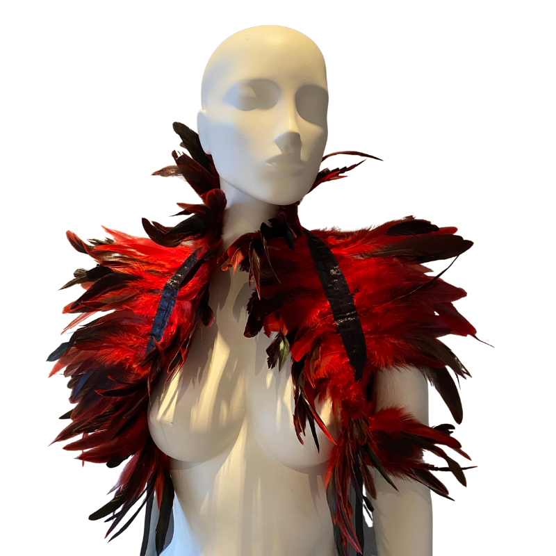 De satijnen band, knoop je achterop de rug en de stola zit op zijn plaats. De veren voelen zacht aan en strelen je huid. Je voelt je geweldig vrouwelijk en krachtig. De veren van deze stola hebben prachtige kleurscharkeringen.