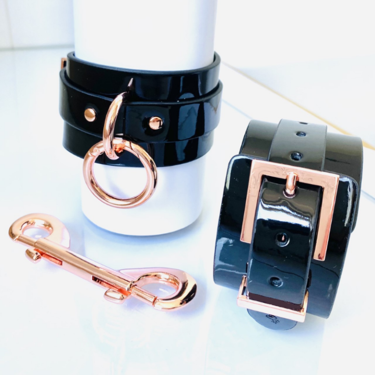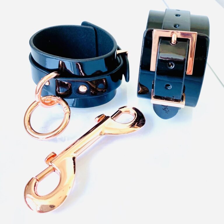 Kinky Diva bondage set zwart lak – hand- & enkelboeien met roségouden accenten