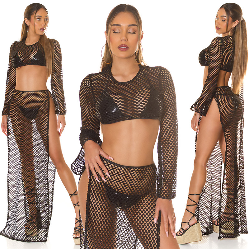 Koucla – Crop Top – Beach – Lange Mouw – Grove Visnet – Zwart Maat L/XL