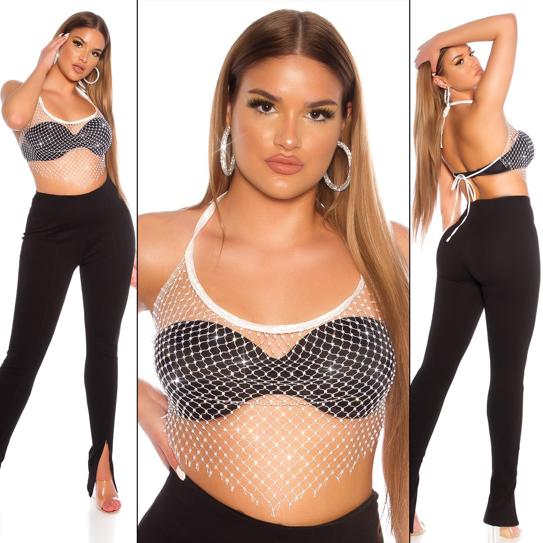 Sparkle with confidence – dit sexy mini haltertopje van rekbaar visnet is bezaaid met fonkelende strass steentjes voor een opvallende en glamoureuze uitstraling. Het transparante netmateriaal laat je huid subtiel doorschemeren en vormt zich soepel naar je lichaam. De speelse driehoekige afwerking aan de onderzijde van de cups benadrukt je rondingen op een brutale, stijlvolle manier.