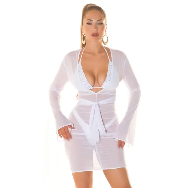 De diepe V-hals laat jouw bikini subtiel zien, terwijl de rest bedekt blijft voor een stijlvolle beachlook. De lange mouwen lopen wijd uit en het strikdetail aan de voorkant kun je op verschillende manieren dragen – speels of vrouwelijk, jij kiest de stijl.