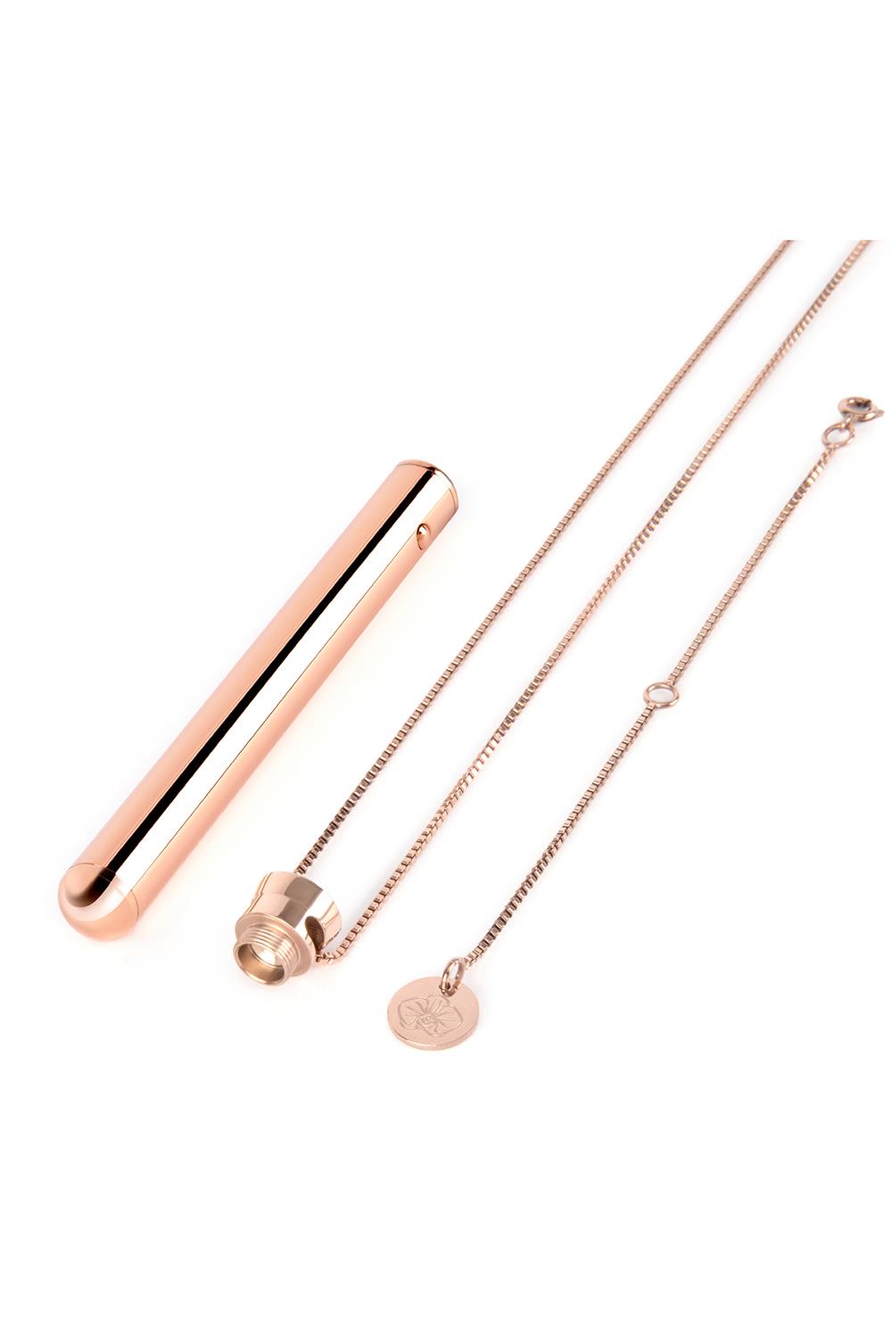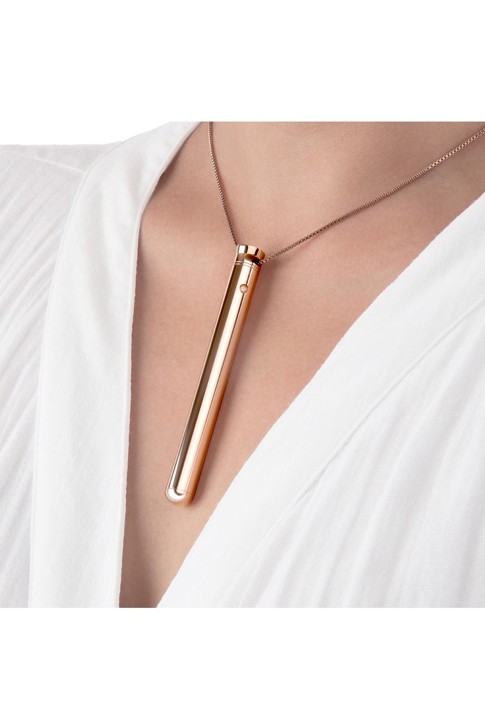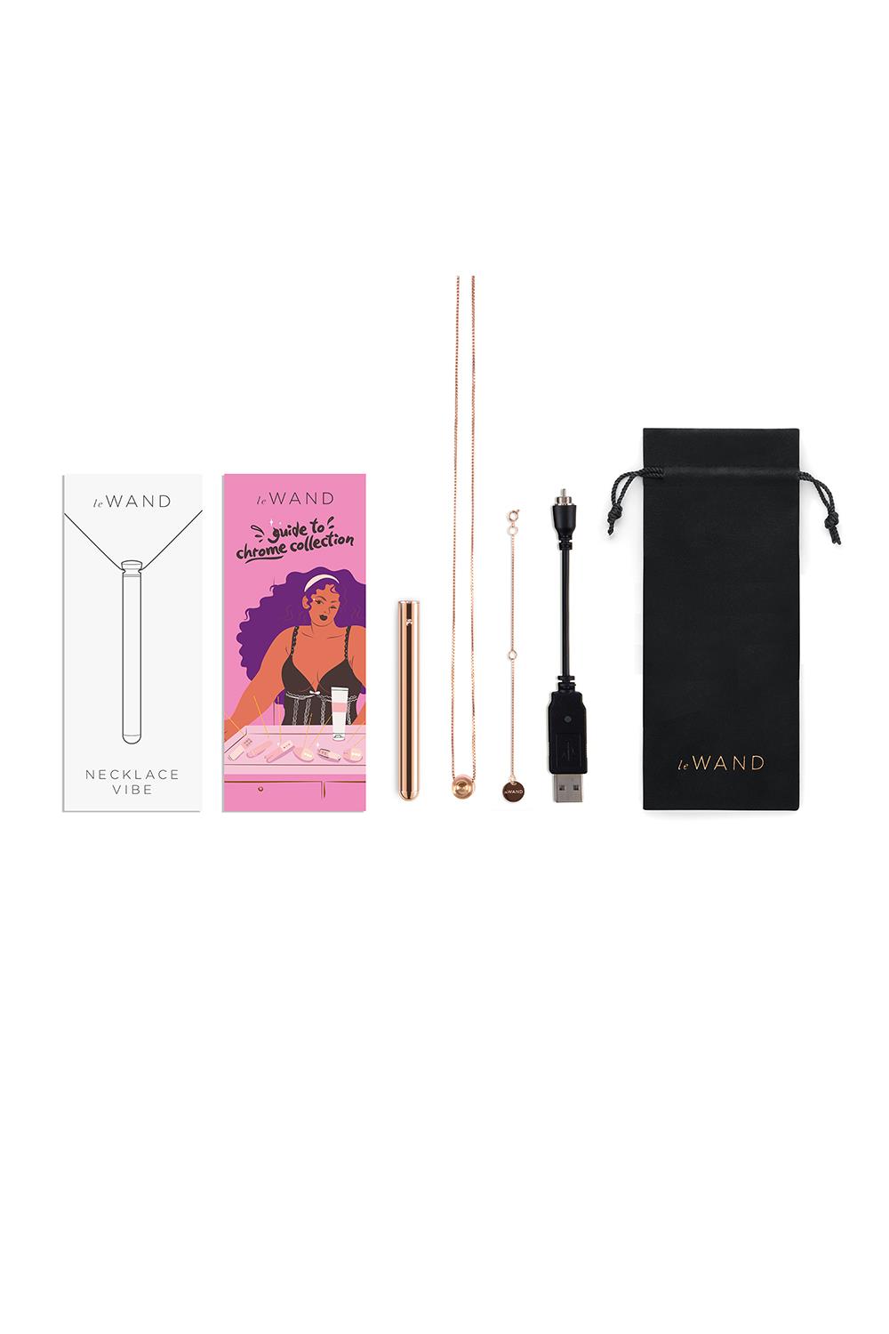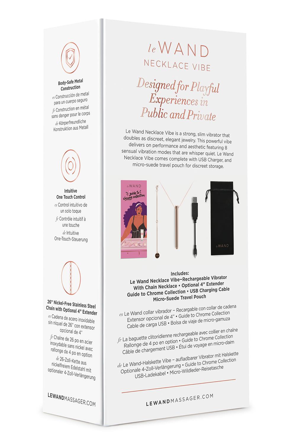 Le Wand Necklace Vibe is een compacte, discrete bullet vibrator voor onderweg. De vibrator heeft 8 vibratiestanden en een hele stille motor. Draag dit elegante sieraad om je hals of neem het mee in het reistasje. Plezier voor onderweg!