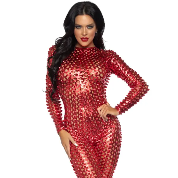 Sexy catsuit in rood metallic. De stof is met halve rondjes opengewerkt, wat een super spannend doorkijk effect geeft. Op de rugzijde zit een rits.