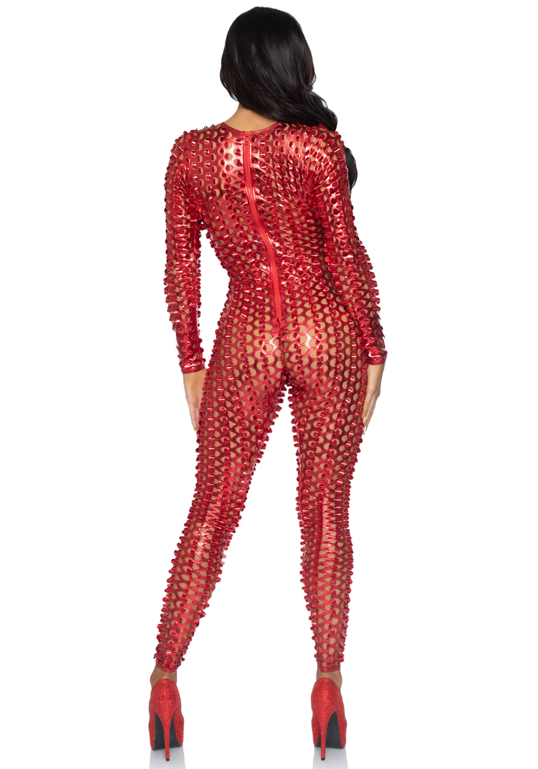 Sexy catsuit in rood metallic. De stof is met halve rondjes opengewerkt, wat een super spannend doorkijk effect geeft. Op de rugzijde zit een rits.