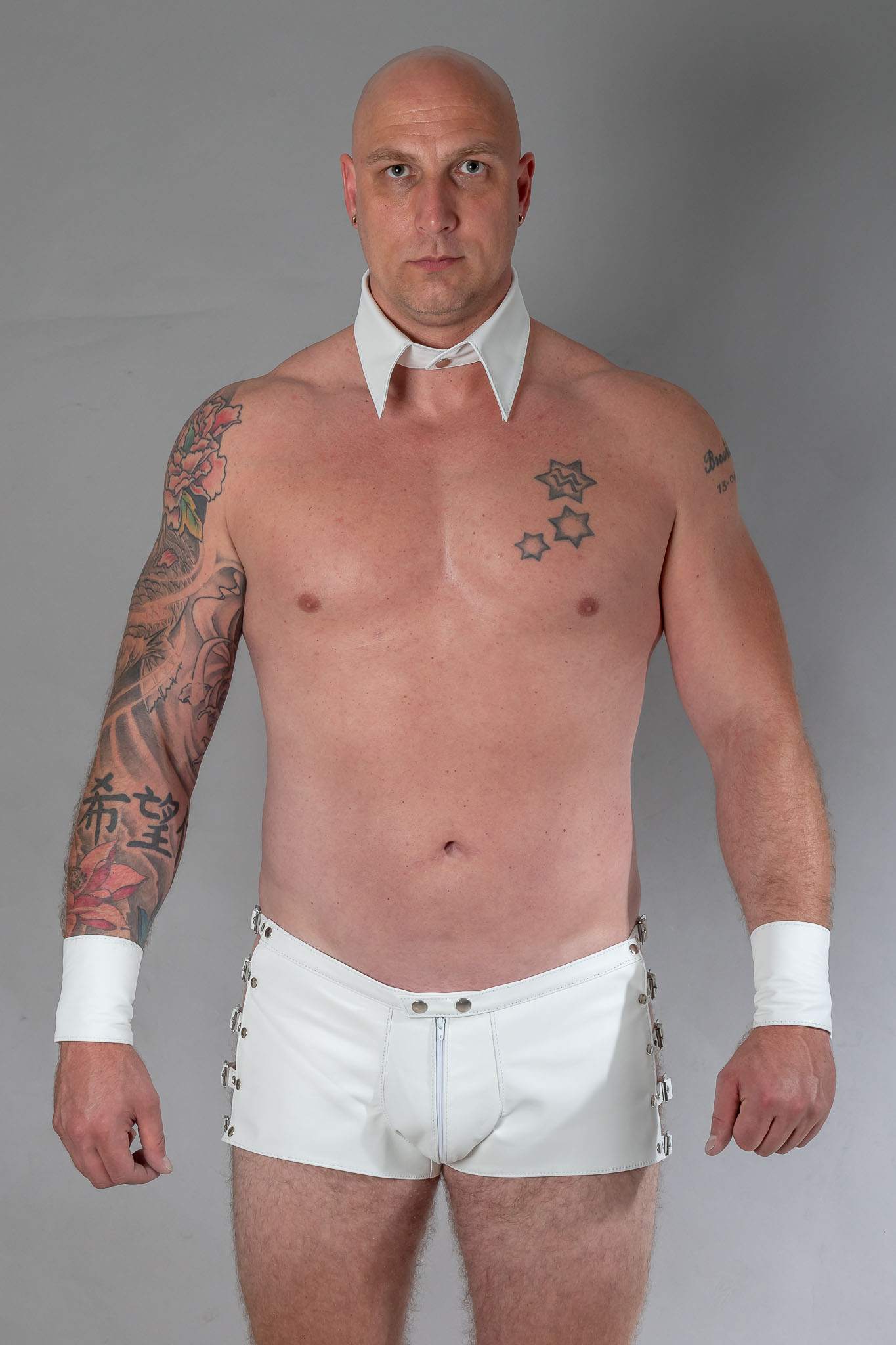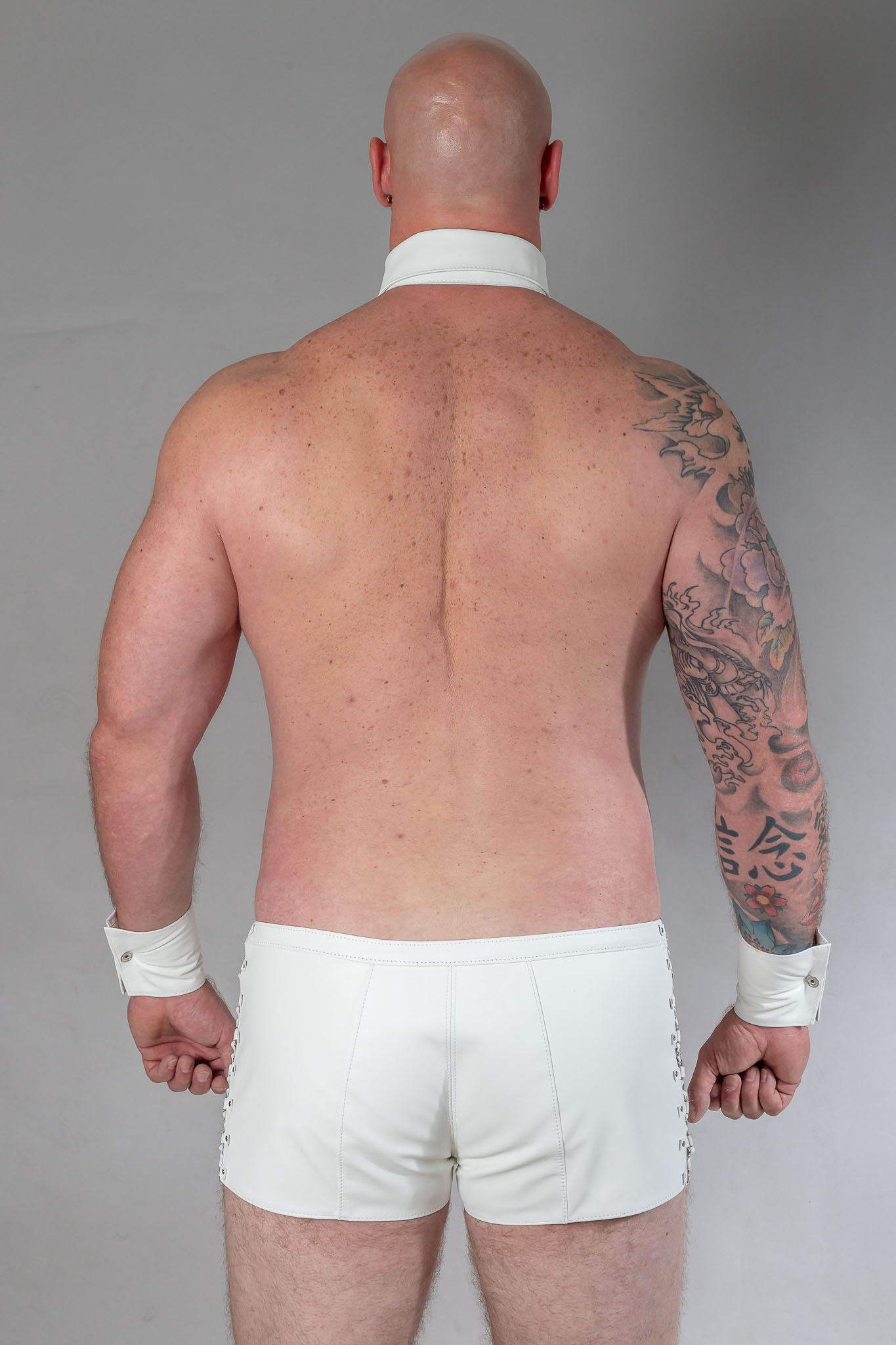 Stoere witte leren manchetten die perfect gecombineerd kunnen worden met heel veel outfits. Je maakt het helemaal af met de bijpassende witte kraag. De manchetten sluiten met een druk knoop.