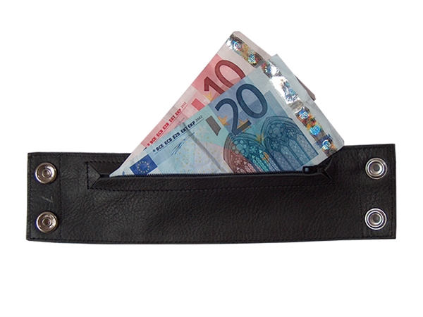 Ideale Leren Pols Sleeve die aan de binnenkant een rits heeft. Hier kun je je geld, muntjes, kaartjes, lockersleutel e.d. perfect in kwijt. En het staat ook nog een stoer bij je outfit. Sluit met 2 drukknopen.