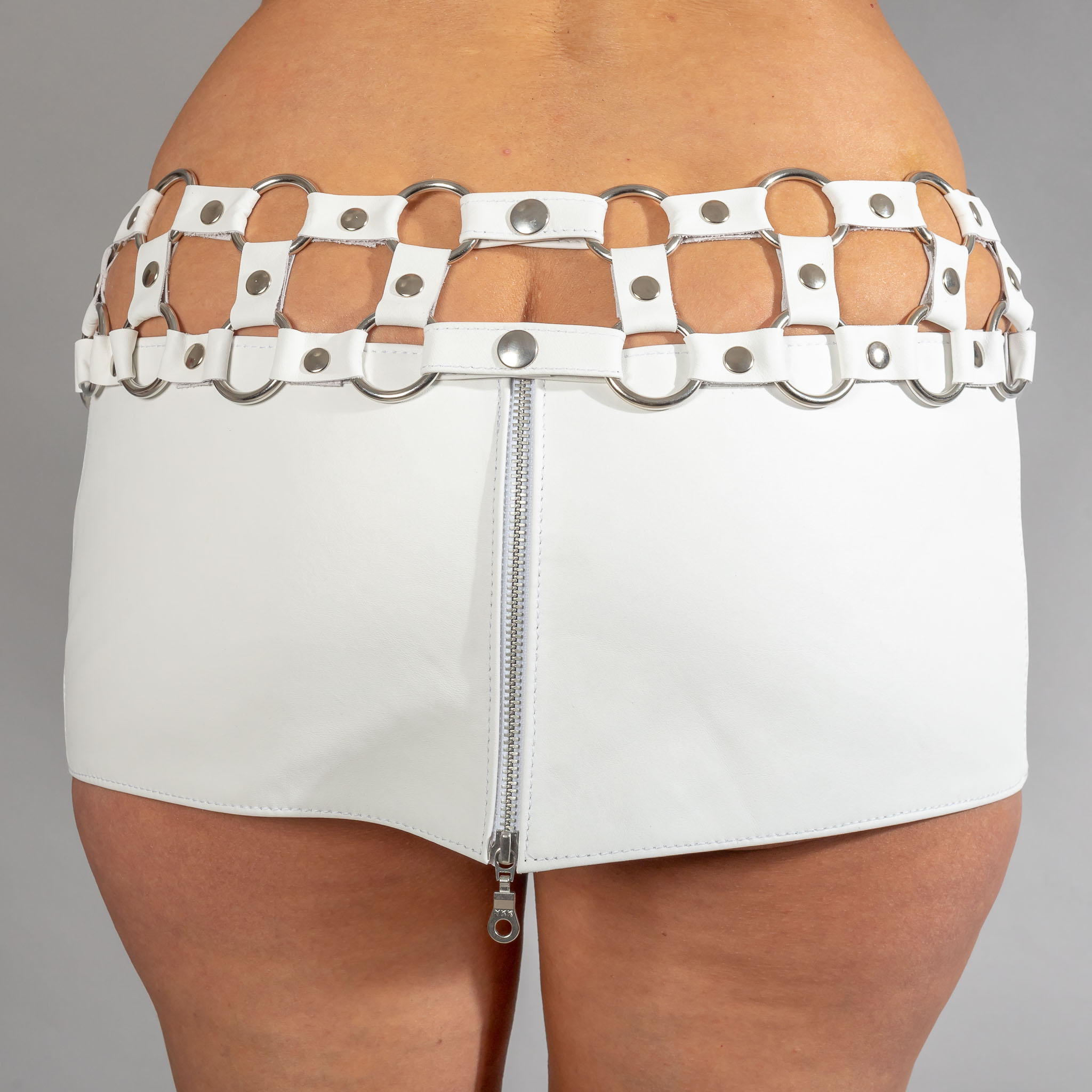 Dit prachtige lamsleren rokje heeft aan de bovenkant een dubele rij grote metalen ringen.. Er zit een rits aan de achterzijde. De lengte van deze exclusieve mini rok is 25 cm.