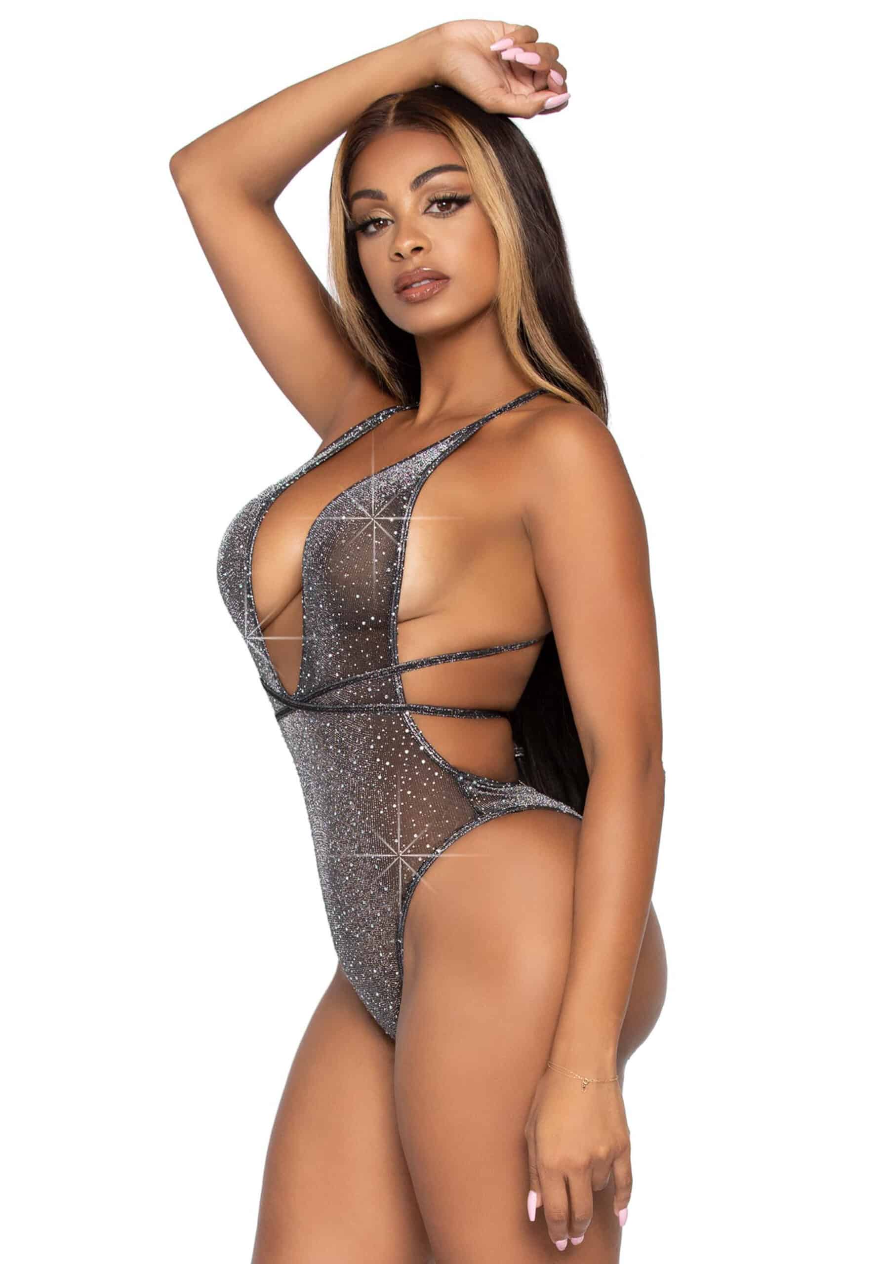 Lurex string body bezet met strass steentjes, strikbare taillebandjes en haltersluiting.