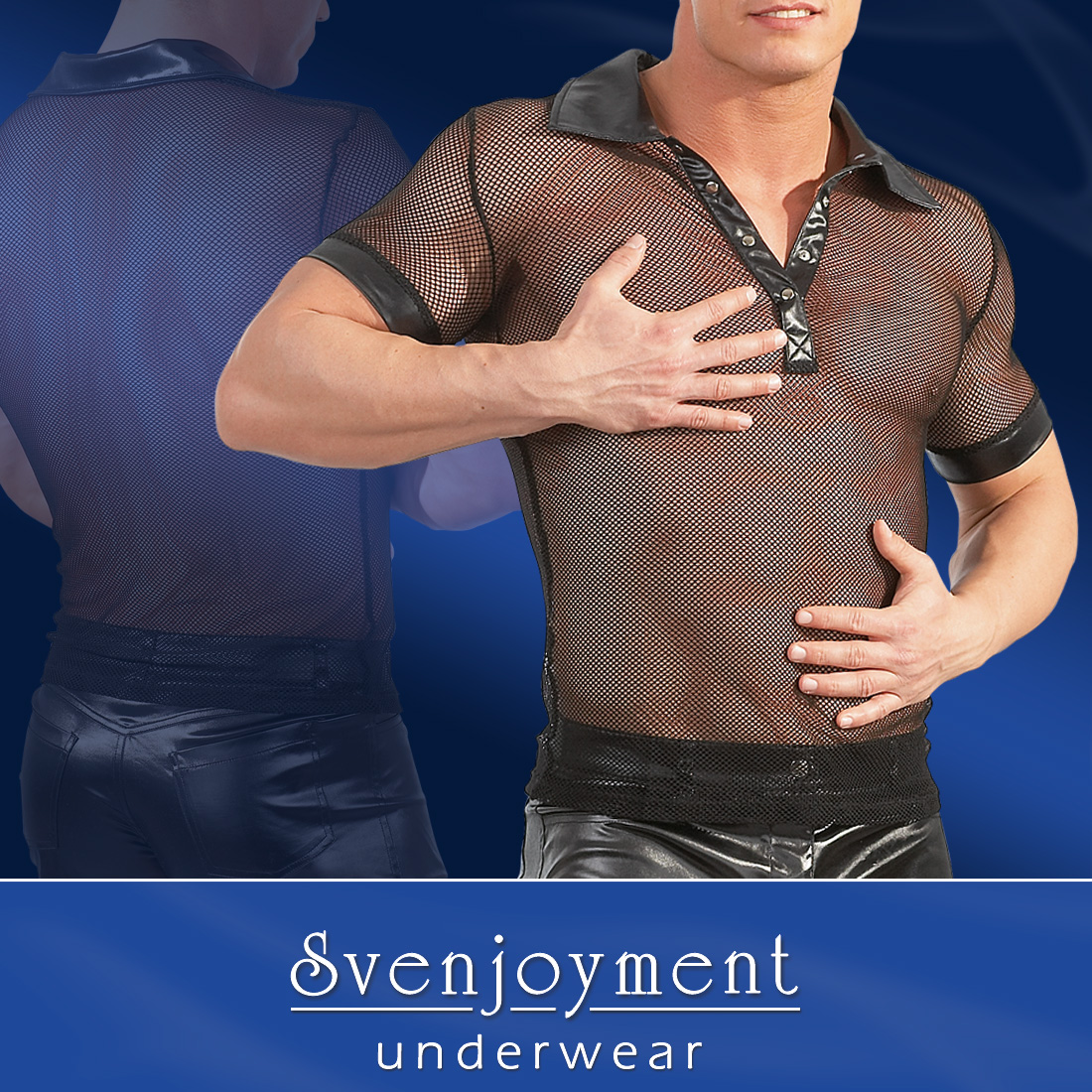 Visnet shirt waarvan het kraagje en de zomen van de mouwen gemaakt zijn van wetlook. Sluit met druk knoopjes.