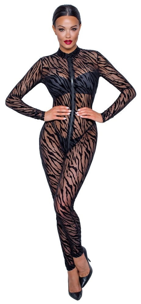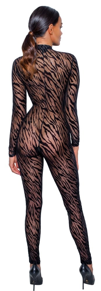 Met deze catsuit laat je zien wie je bent! Deze transparante catsuit met een decoratieve flockprint in safariprint heeft een 3-zijdige rits die helemaal tot in je kruis doorloopt. Het is gemaakt van super stretchy gaas en zit hierdoor heel comfortabel. Een echte must-have in je sexy garderobe!