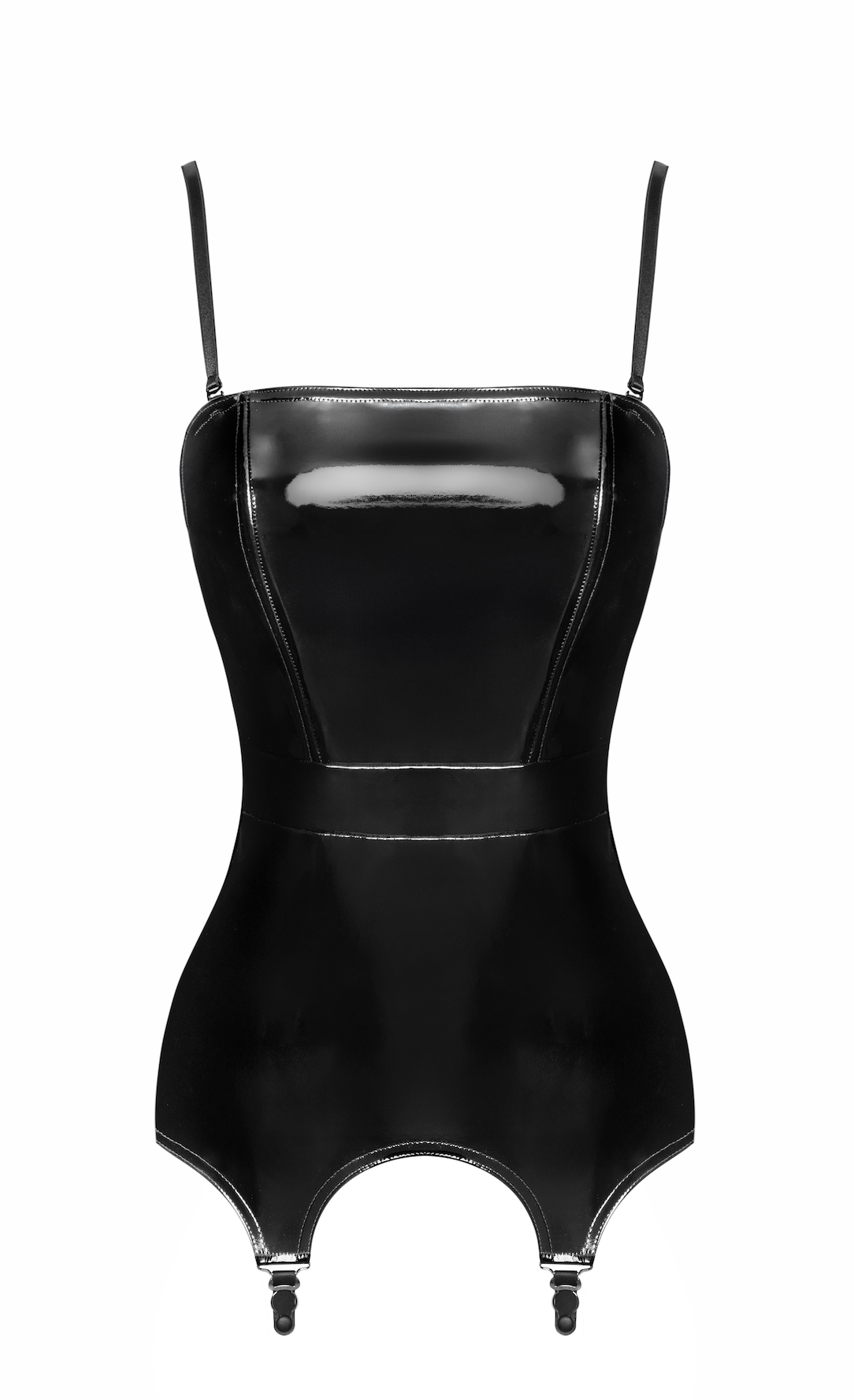 - Corset en jarretelgordel in één, gemaakt van glanzend zwart lak