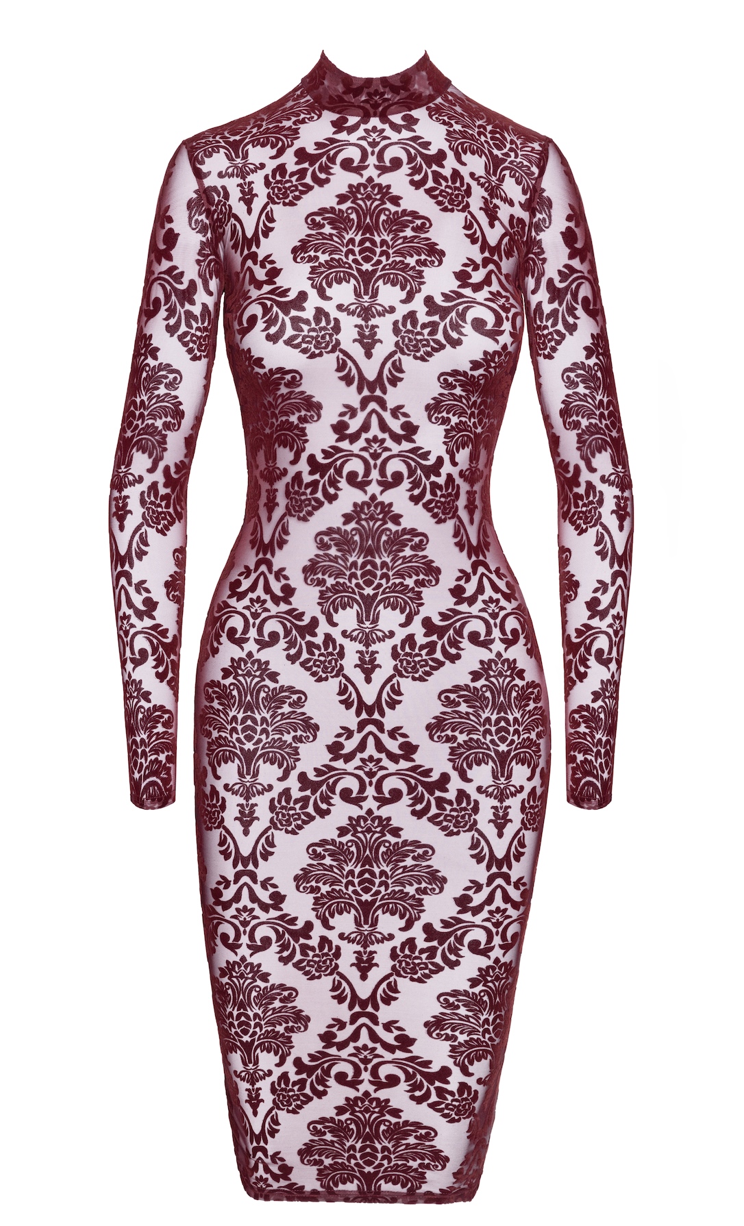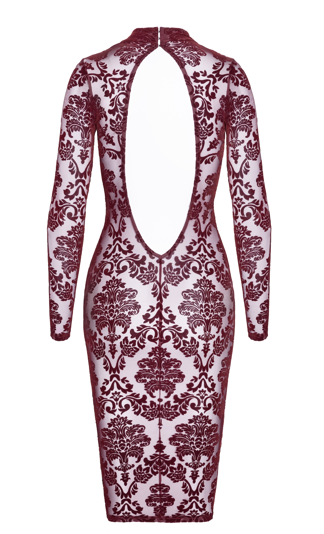 Deze jurk straalt klasse uit, maar laat nét genoeg zien om hoofden te doen draaien. De lange mouwen en staande kraag geven de jurk een geraffineerde look, terwijl de open rug zorgt voor dat onverwacht sexy element dat niemand zag aankomen. Het gaas met fluwelen flochprint is transparant, stretchy en met een fluweelzachte touch.