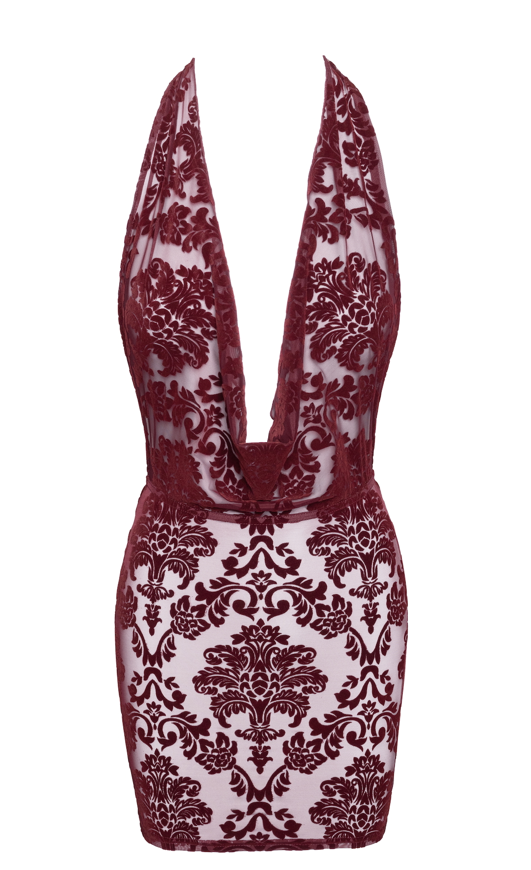Laat je verleiden door de koninklijke allure van deze transparante bordeaux mini jurk met open rug en watervalhals. Chic, gedurfd en onweerstaanbaar sensueel.