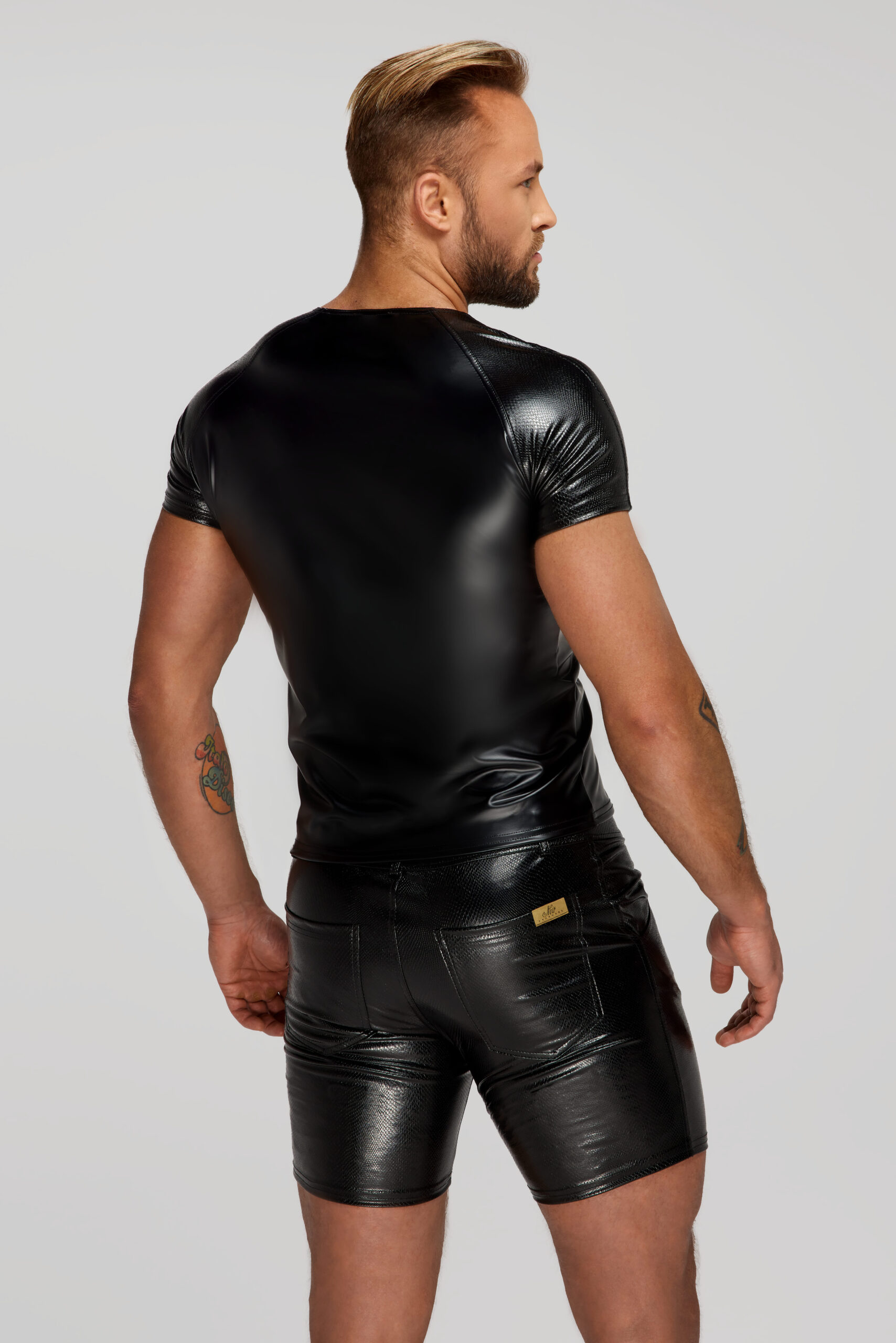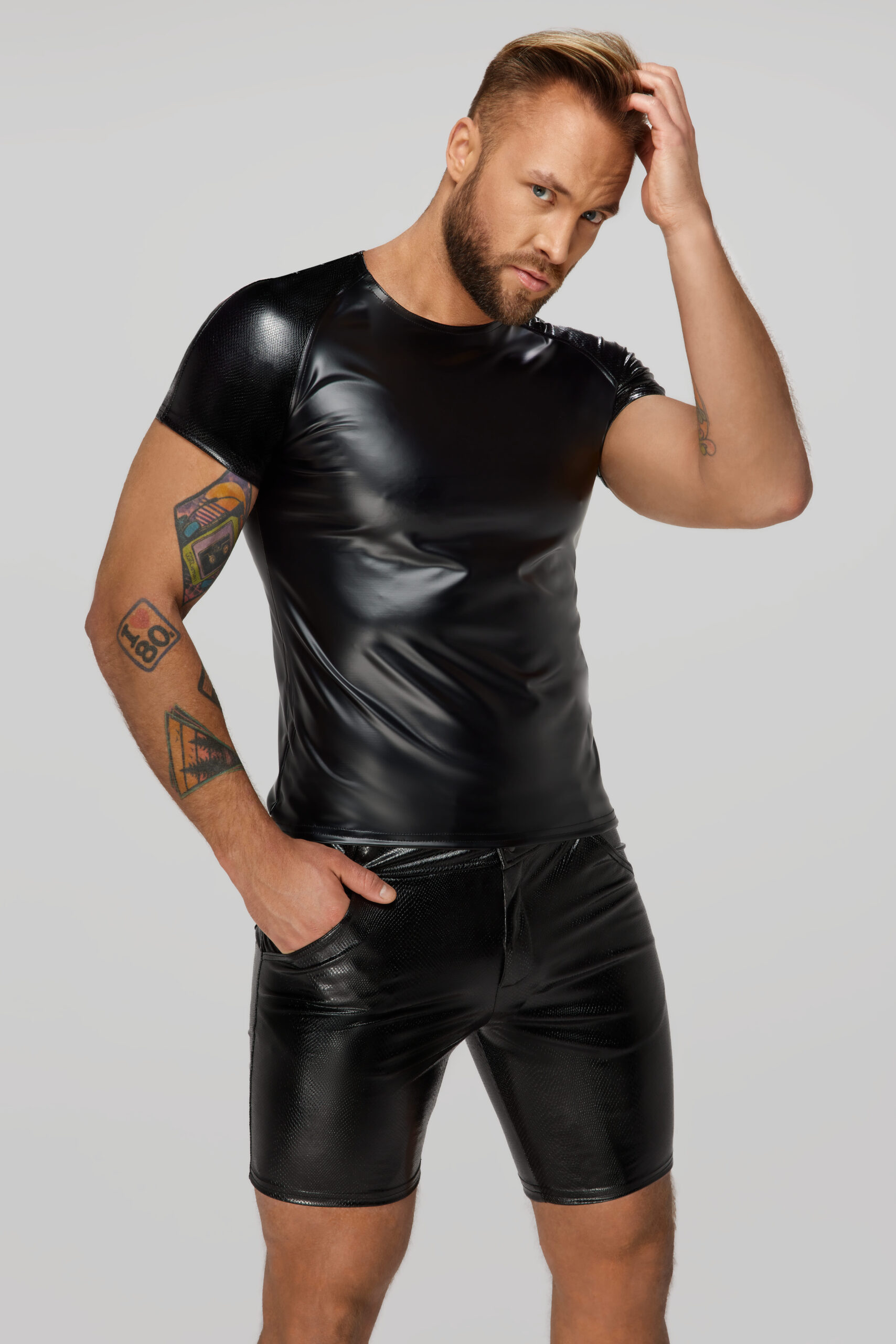 Een prachtig klassiek shirt van zwart wetlook waarvan de mouwen van wetlook met snakeprint zijn. Dit geeft het shirt heel veel cachet en uitstraling.