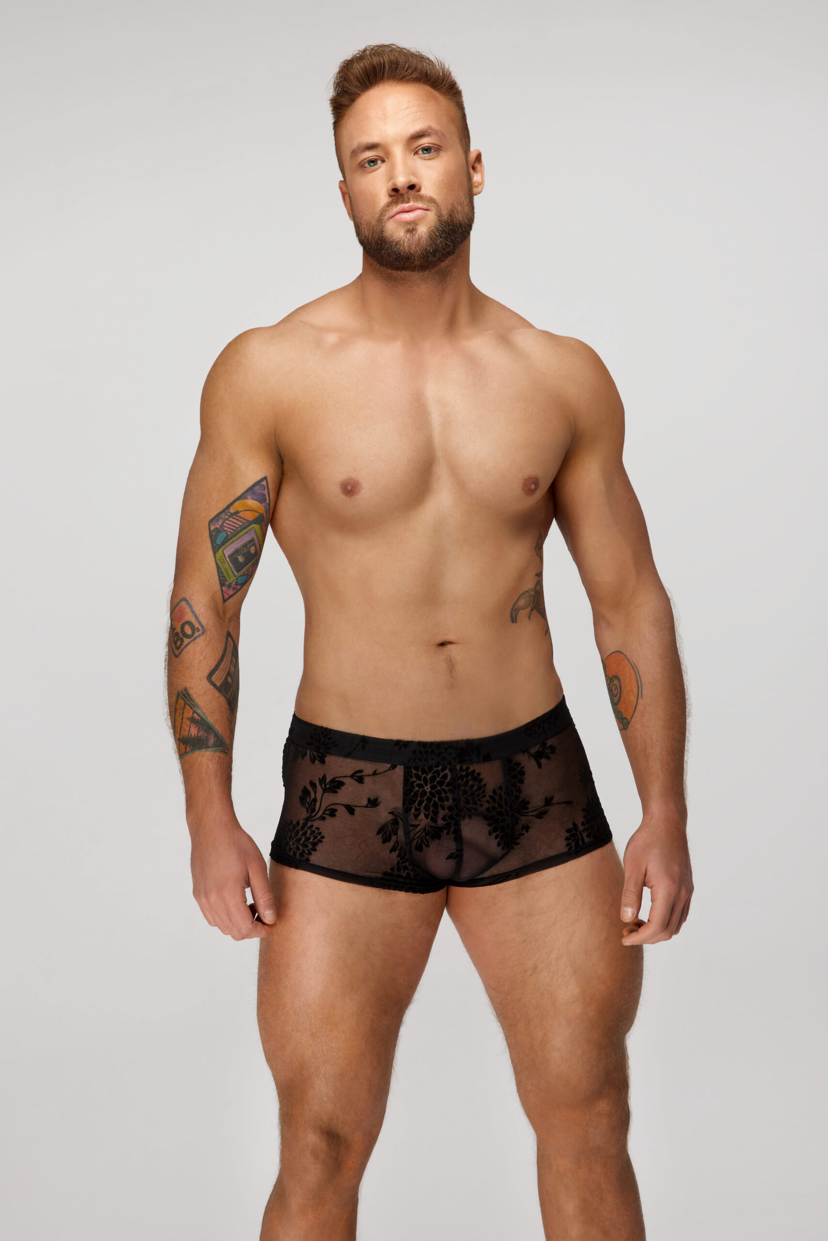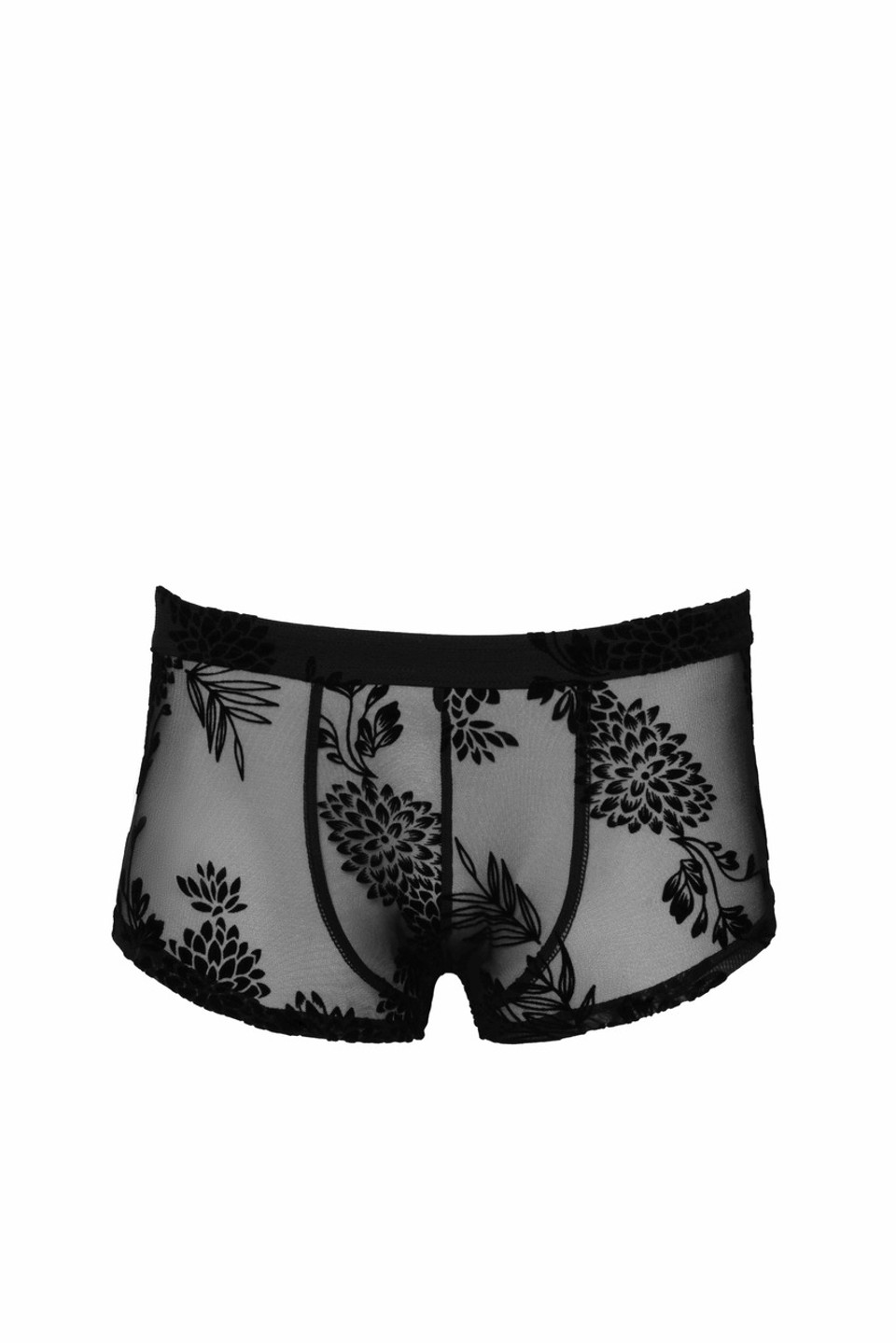 Een sexy en opvallend short van gaas met een spannende flockprint met een bloemenmotief.