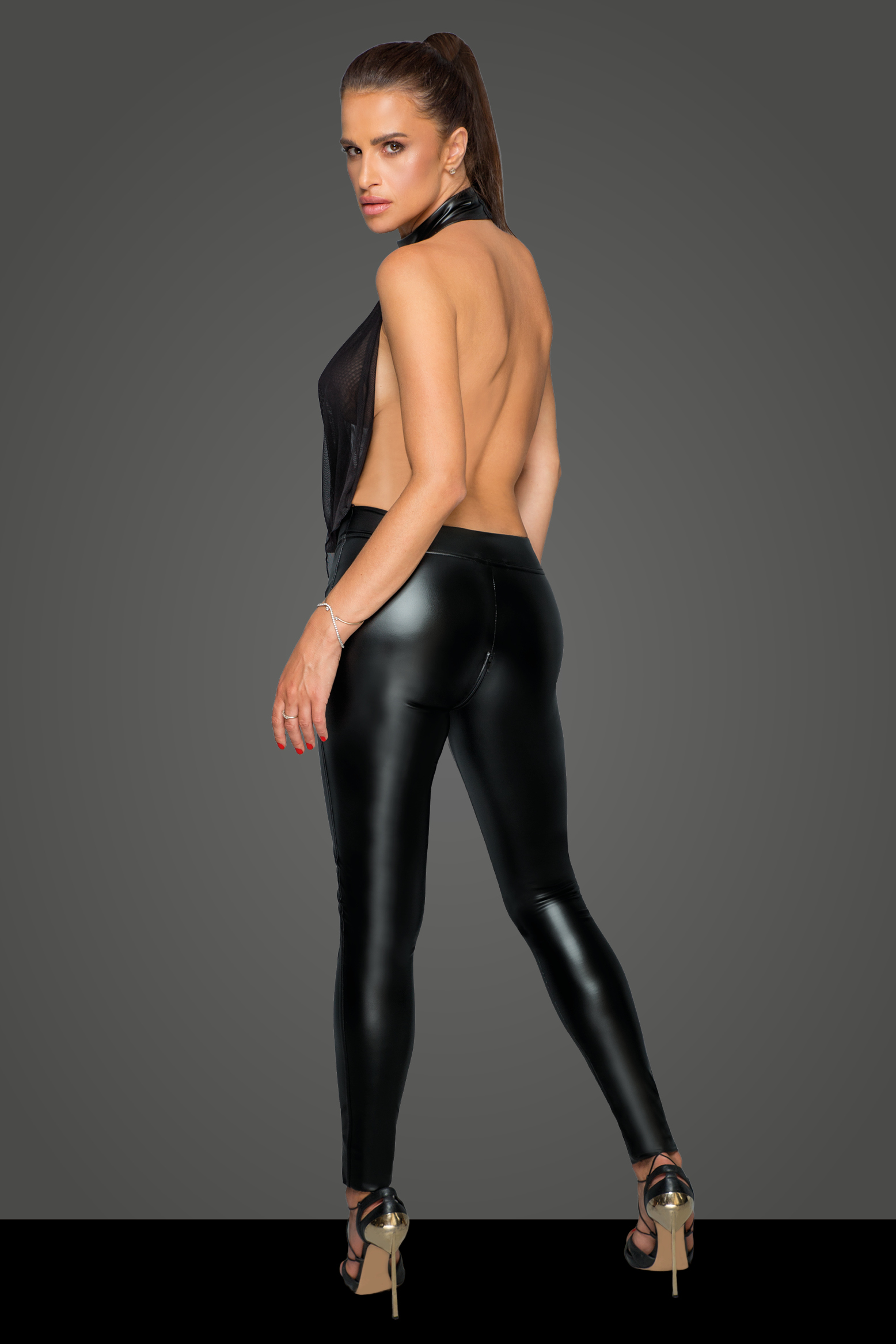 Een waanzinnig sexy catsuit die niet in je sexy garderobe mag ontbreken. Het waterval topje van gaas heeft een spannende wetlook choker met strass accenten. In deze catsuit komt jouw blote rug prachtig uit. De onderkant van de catsuit is gemaakt van stretchy wetlook. Deze catsuit heeft een handige rits in het kruis die doorloopt tot de bovenkant van de billen.