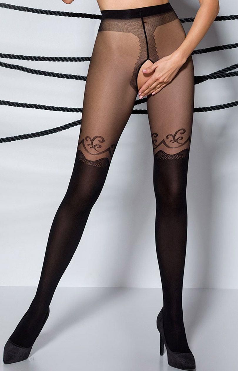 Sexy en spannende panty met een versterkt, opengewerkt kruisje. De pany heeft ingeweven kousen met een sier motief voor een spannend effect en super sexy benen.