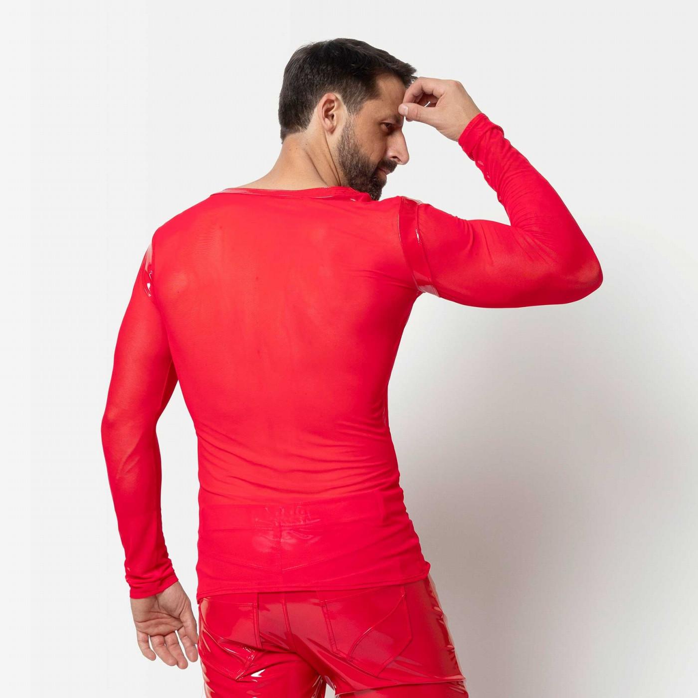 Door de lange mouwen en de mooie snit heeft dit Ali Tee Shirt een chique uitstraling. Het rekbare doorzichtige gaas zit strak om jouw lijf. De lak accenten over de schouder en langs de diepe V hals geven de borstpartij extra aandacht. Hoe sexy wil je het hebben!